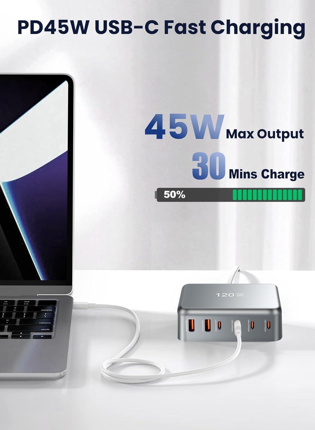 【45W USB-C Super Charging】4 USB-C ports deliver up to 45W each (20W+20W+45W+45W) for rapid laptop/tablet charging with PD 3.0, QC 4.0+, PPS protocols