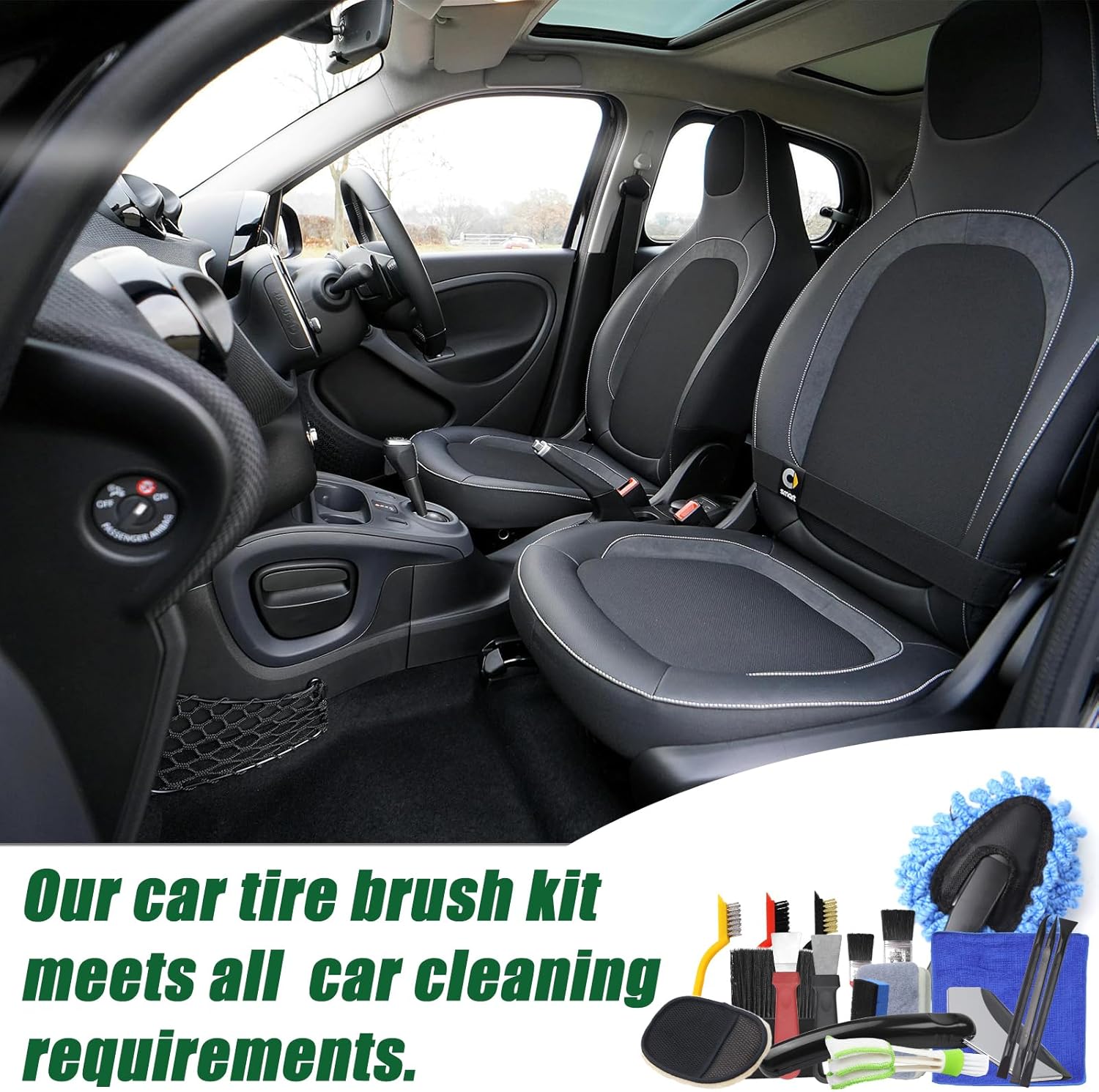 Practical accessories: this package contains 18 x car tyre brush set: 3 x hob brush, 1 x straight spatula knife, 1 x curved spatula knife, 2 x red dust brush (1 inch/1.51 inch), 3 x lever iron, 1 x car wash mop, 1 x car wash gloves, 1 x double ended soft brush, 1 x cleaning cloth, 1 x polishing cloth. 1 x Foam Sponge 1 x De-icing Scoop 1 x Black Cleaning Brush Our car interior care set can meet all car cleaning requirements.