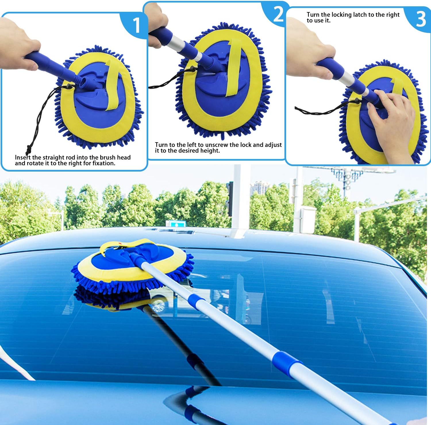 🚙【Say Goodbye to Straining Your Back:】The high quality aluminum alloy pole is hard, firm and light and difficult to rust. The mop pole of car washing kit can be adjusted to any length will help you to clean the different height and place where you can not wash by hand. Avoid having to stretch, bend over or twist to get everything done . Not only can this lightweight aluminum alloy design extend out 45 inch long but also offer an easy 180 degree cleaning angle.