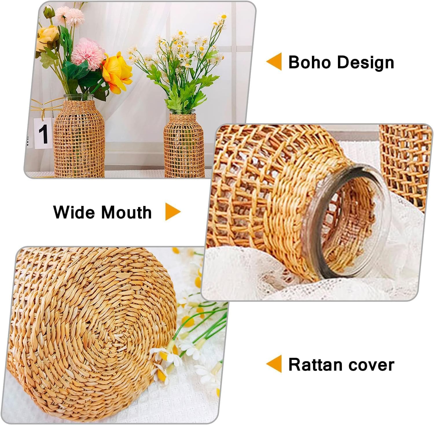 Made of high-quality rattan and glass materials, looks unique and retro, the rattan protects the fragile glass vase from being broken, and the flat and close rattan bottom keeps the glass vase away from sharp objects and prolongs its lifespan