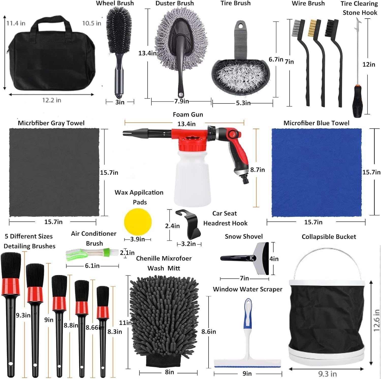 1 Low-pressure foam gun with adjustable twist nozzles, quick coupling and leaking-proof tape, 1 Collapsible bucket(5 Gallon), 1 Snow shovel, 4 Car seat headrest hooks, 5 Detailing brushes, 3 Wire brushes, 1 Window water scraper, 1 Wash mitt(8″x11″), 2 Absorbent towel(15.7″x15.7″), 1 Duster, 1 Tire brush, 1 Wheel brush, 1 Air conditioner brush, 1 Tire clearing stone hook, 4 Wax applicator pad, 1 storage bag(11.8″x9″x4″)