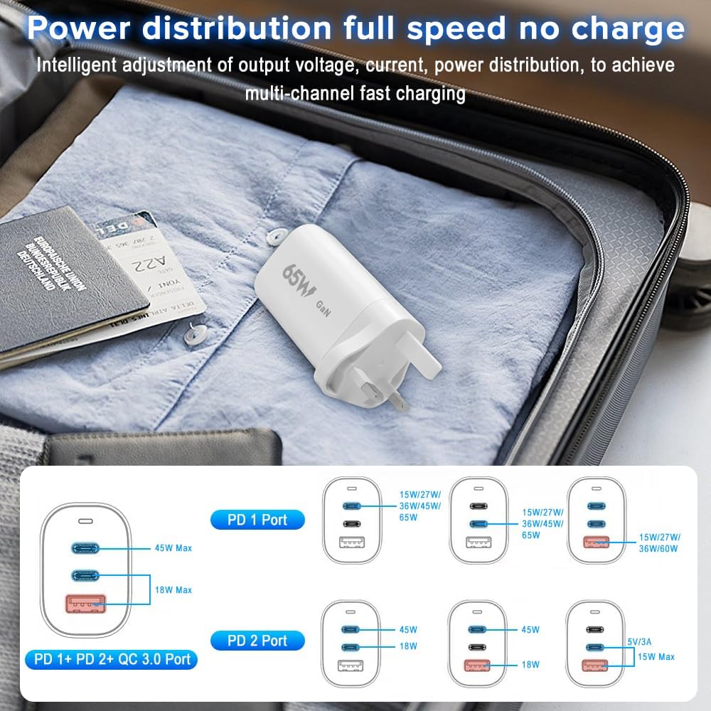 65W GaN USB C Charger,QC 3.0 Quick Charge,PD 3 Port 2x USB-C & 1x USB-A Charger Type C Power Adapter Compatible,for Phones, Computers, Cameras(White)