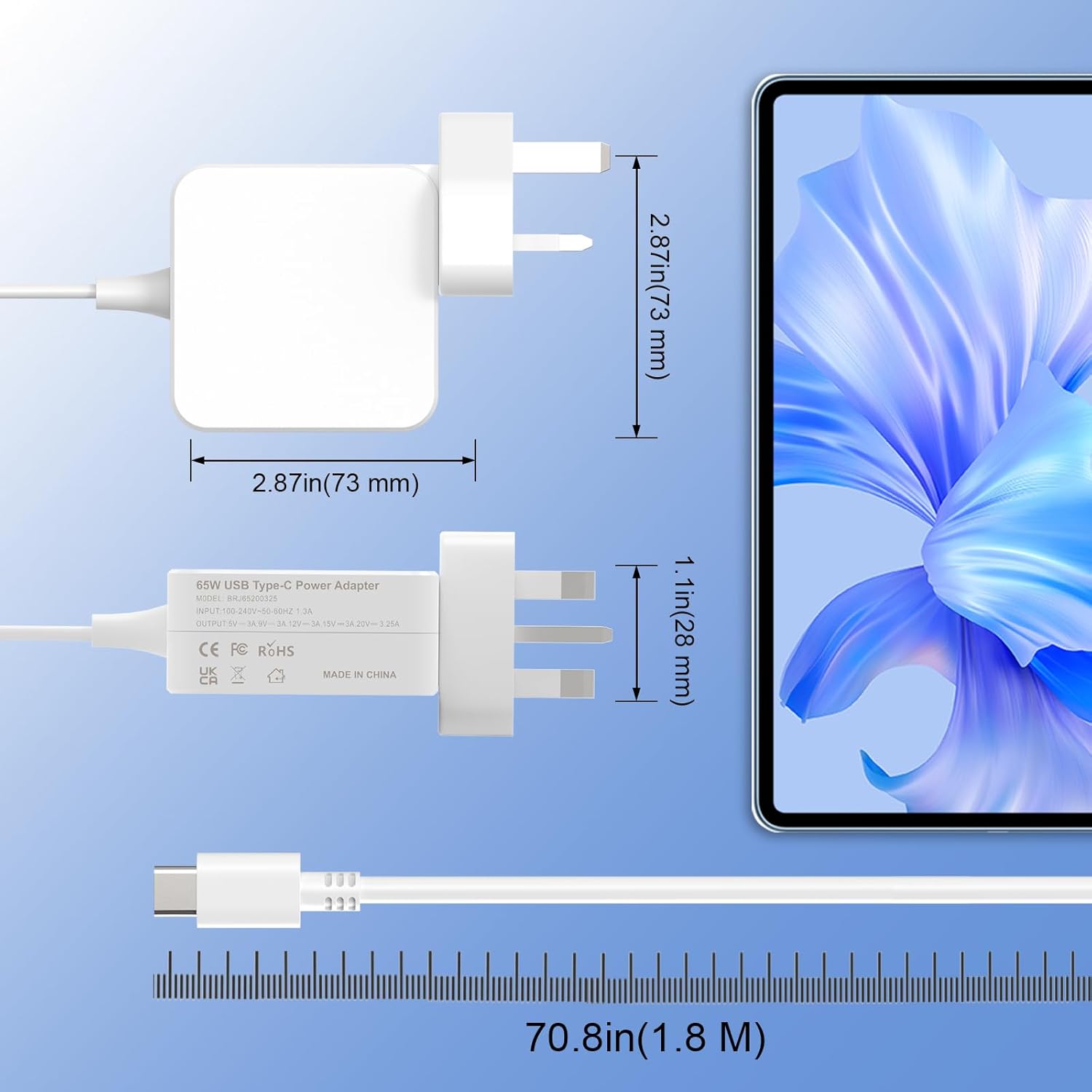 65W 45W Type C Laptop Charger USB C PD adapter; Input Voltage: 100-240V 50-60Hz 1.8A; Output: 20V-3.25A, 20V-2.25A, 15V-3A, 12V-3A, 9V-3A, 5V-3A; Connector Size: USB Type C