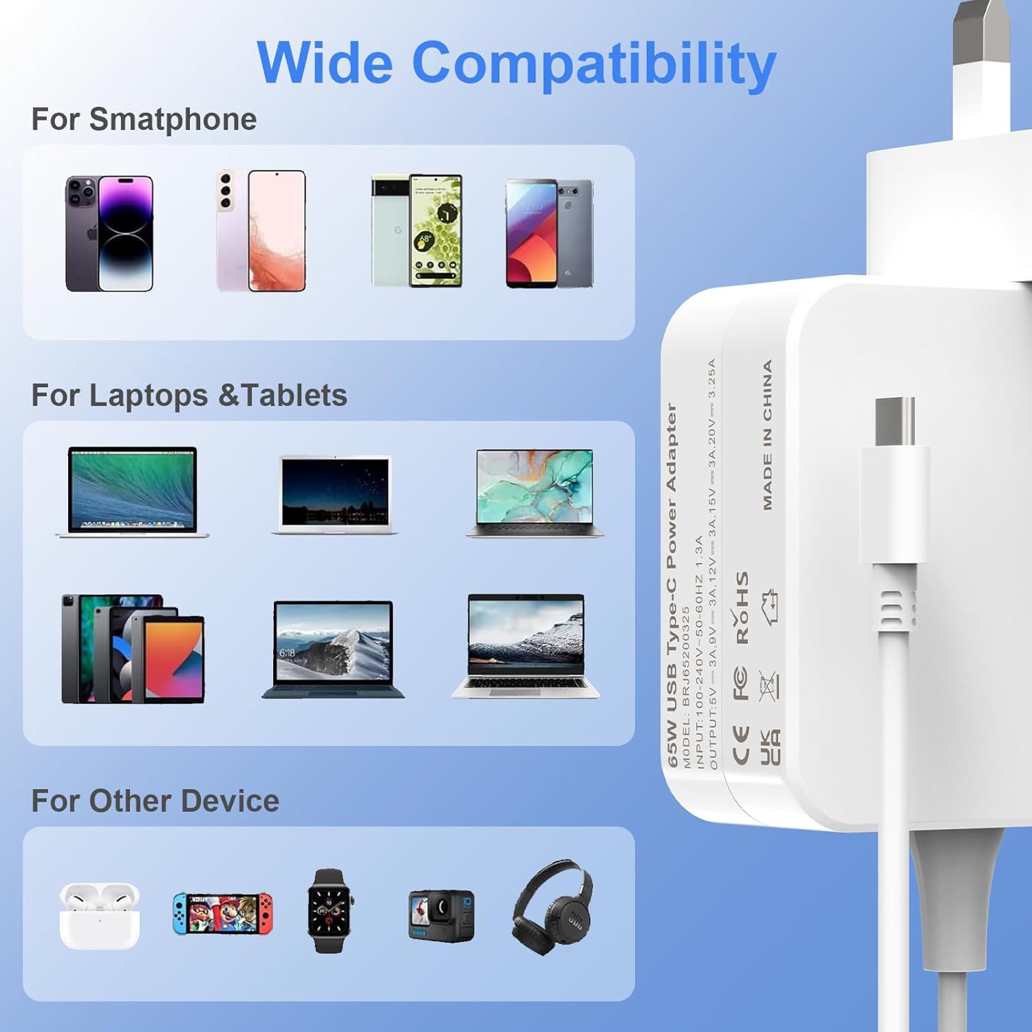 Home Electronics & Accessories 65W Type-C Laptop Charger Compatible with Huawei Matebook Honor MagicBook Asus ROG HP Lenovo Thinkpad Macbook Dell Acer Chromebook MSI InnJoo and Other USB C Power Adapter
