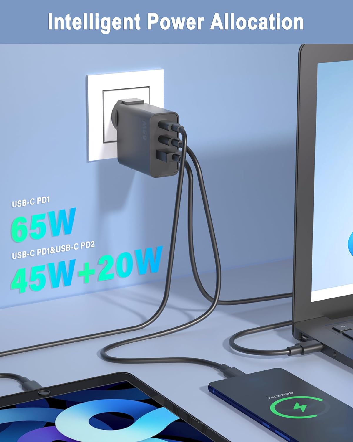 🔋【Fast 65W PD 3.0 QC 3.0 PSS GaN Charging Block】:Power up your devices with dual 65W PD 3.0 USB-C ports and a USB-A port, delivering rapid charging for all your electronics. Recharge your 13” MacBook Air from 0% to 100% in just 2 hours when using a single port—experience the ultimate in charging speed!