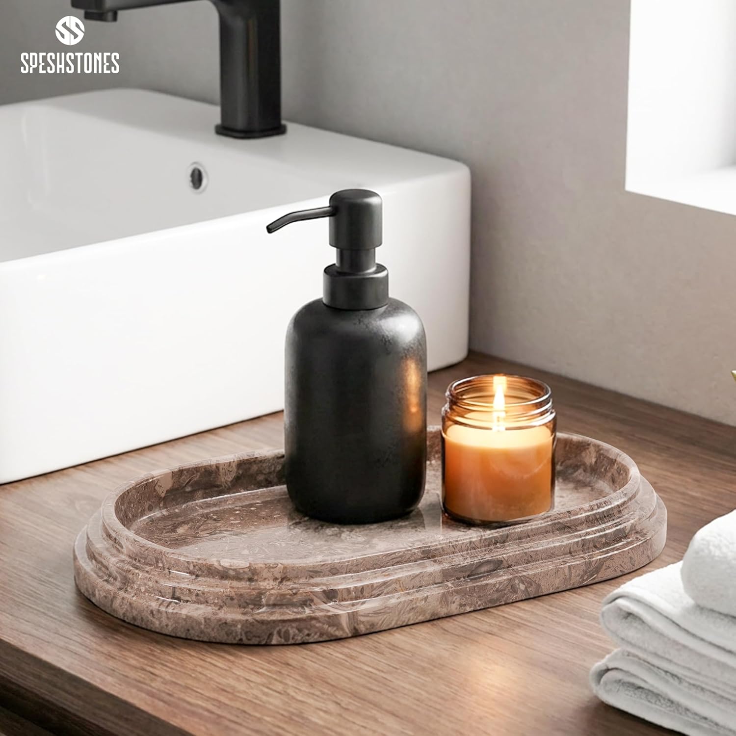 Each tray is handcrafted from natural marble, making it a durable and stylish addition to any home. Perfect as a vanity tray for bathrooms, a serving tray for entertaining, or a countertop organizer for everyday items.
