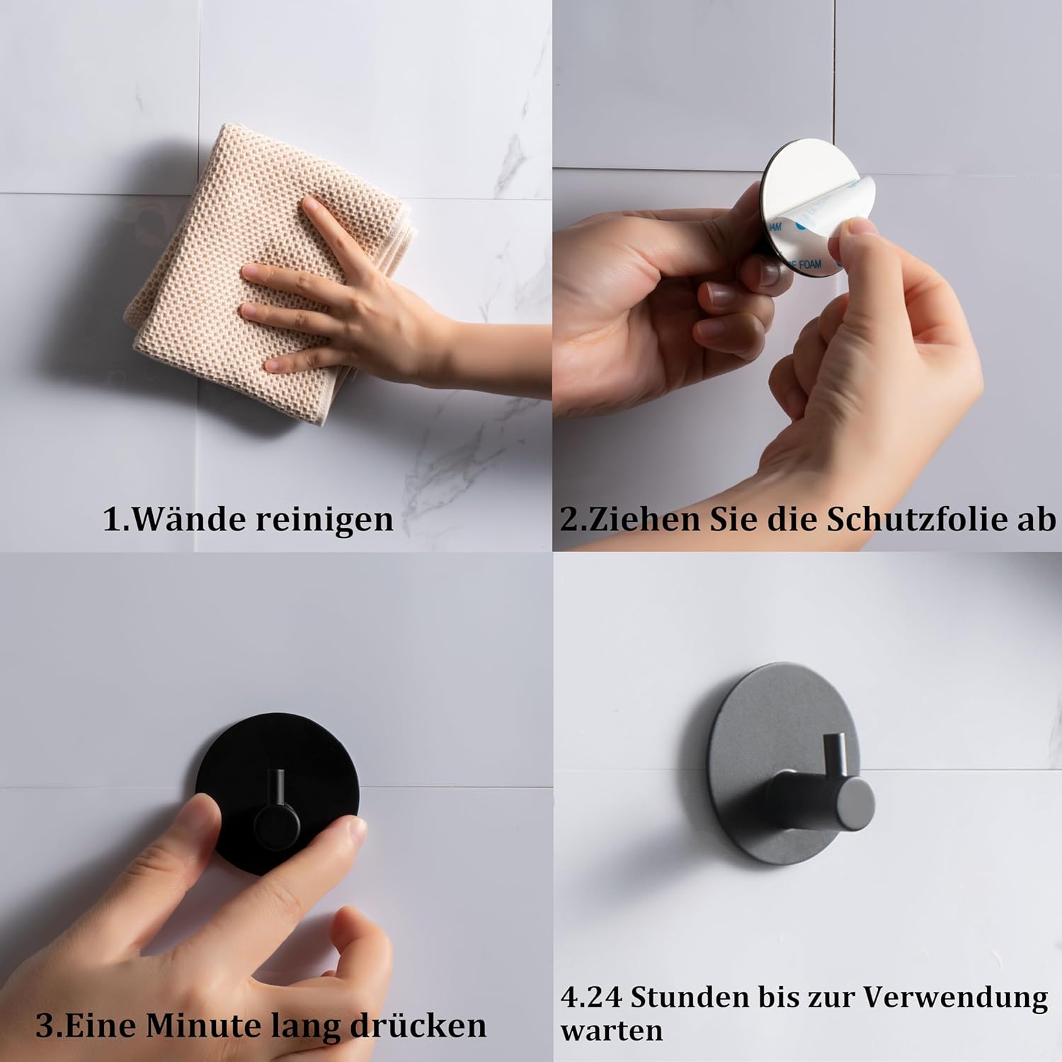 𝐄𝐀𝐒𝐘 𝐈𝐍𝐒𝐓𝐀𝐋𝐋𝐀𝐓𝐈𝐎𝐍:You just need to tear off the protective film of 3M adhesive behind the bathroom hook and then it can be pasted on the smooth wall, no need to drill holes on the wall, and will not damage the wall, saving time and effort