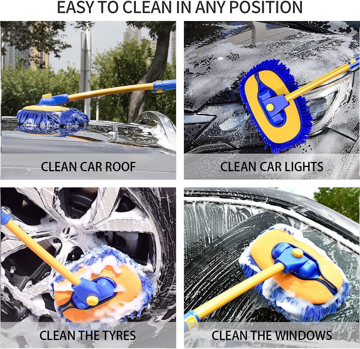 4. This mop is perfect for cleaning different types of cars, trucks, vans, SUVs, , RVs, boats. The extra-long car wash mop is easy to maneuver, even on the roof.