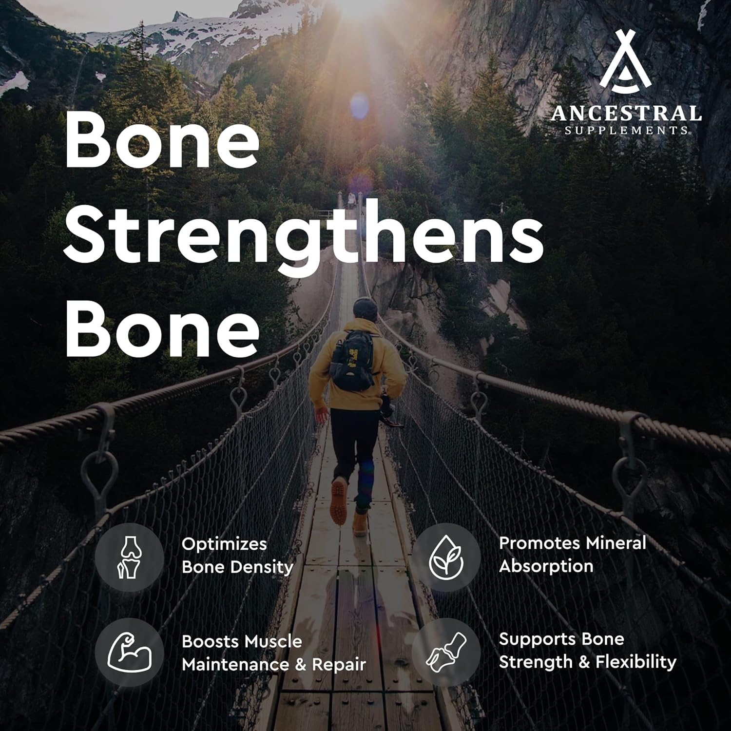 GRASS FED LIVING BONE contains… Calcium and Phosphorous in the ideal physiological ratio of 2:1 Essential Trace Minerals as well as Type I Collagen Molecular Biodirectors — DNA Blueprints To Build and Repair Healthy Tissue Bone Stimulating Proteins (IGF I & II, TGF β, Osteocalcin) *One capsule of Living Bone contains 250mg of calcium. One bottle of Living Bone can support your calcium needs for 60 days!* GRASS FED LIVING BONE supports… Optimal Bone Mineral Density * Bone Strength and Flexibility * Absorption of Calcium and Phosphorous * Muscle maintenance and repair * GRASS FED LIVING BONE (like all of our products) is… Pasture Raised In New Zealand & Australia Grass-fed & Grass-Finished Hormone, Pesticide & GMO Free Absolutely No Fillers (or) Flow Agents 100% Low-Temp Vacuum Dried In Contrast To The High Heat Processed Varieties Non-Defatted, Left As Organs Exist In Nature Third Party Tested For Purity To know more about the wise ways of our early ancestors, go to Ancestral Supplements (or) visit our page dedicated to all things Grass Fed Living Bone related. * The statements made on this website have not been evaluated by the Food & Drug Administration. These products are not intended to diagnose, prevent, treat, or cure any disease. U.S. CUSTOMERS ONLY We are happy to offer a “Subscribe & Save” service for your convenience. Please be advised that if you select the subscription service, you will not be able to apply any other discount codes on top of the 10% discount associated with the subscription. If you have any questions, please send us an email to tribesupport@ancestralsupplements.com. INTERNATIONAL ORDERS / CUSTOMS INFORMATIONAll international sales are final. Once you place your order, we will not issue a refund. If you live in the EU, feel free to use ERGOMAX to order your Ancestral Supplements.We cannot be responsible for problems that you may encounter with your customs authorities. If your order is held up by your country’s customs authorities, it is your responsibility to secure the products. We are not familiar with international customs policies that are unique to each country. As such, it remains the customer’s responsibility to be familiar with all import policies which may include: customs fees, VAT, import fees and/or any other fees associated with import.Once again, we are not responsible for products once they reach your country. If you are not comfortable with this policy, please refrain from ordering.