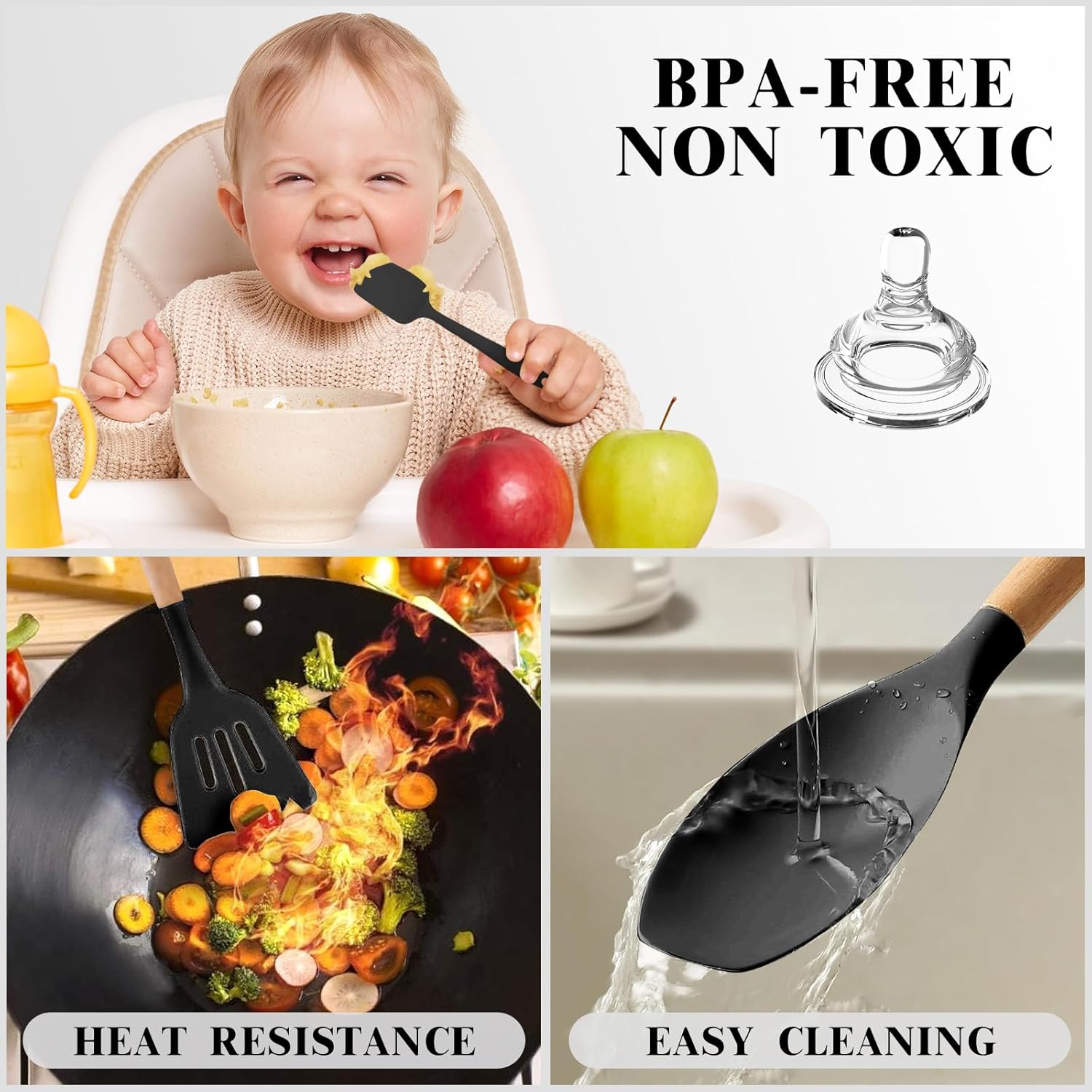 š„ćSafe,BPA-free&Food Grade SiliconećMade of Food-grade Silicone, BPA-free and can be Used on Any Type of Food.It will Probably Last Longer than Other Plastic Kitchen Utensils.These Silicone Cookware will not React with Food or Drinks,so don’t worry about your Family’s Health.On first use, it is Recommended to Soak for Half an Hour and Expose to Air for about 3 Hours to Eliminate the Initial Odor.