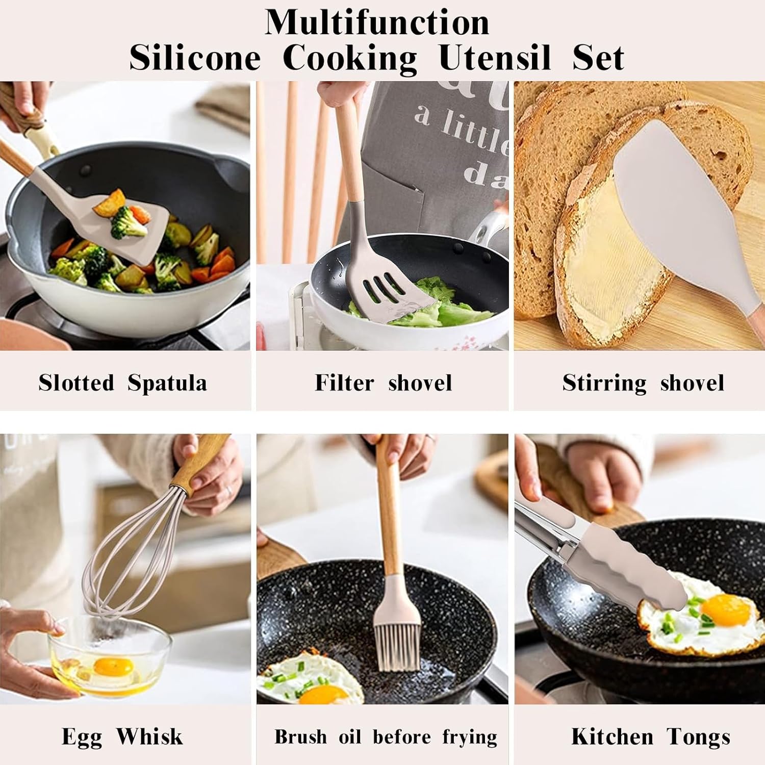 š„ćHigh Temperature WithstandćThe Silicone Cooking Utensils can Heat-resistant up to 446°F/230°C,won’t metl even when Frying.Full Silicone Added to the Softness, no Longer Worry Food will Stick your Cookware.The Silicone Head Protects your Pan from Scratches or Dents on the Surface of your Cookware.Comfortable Wooden Handle can Prevent Heat Transfer and Provide a Safe Cooking Experience.