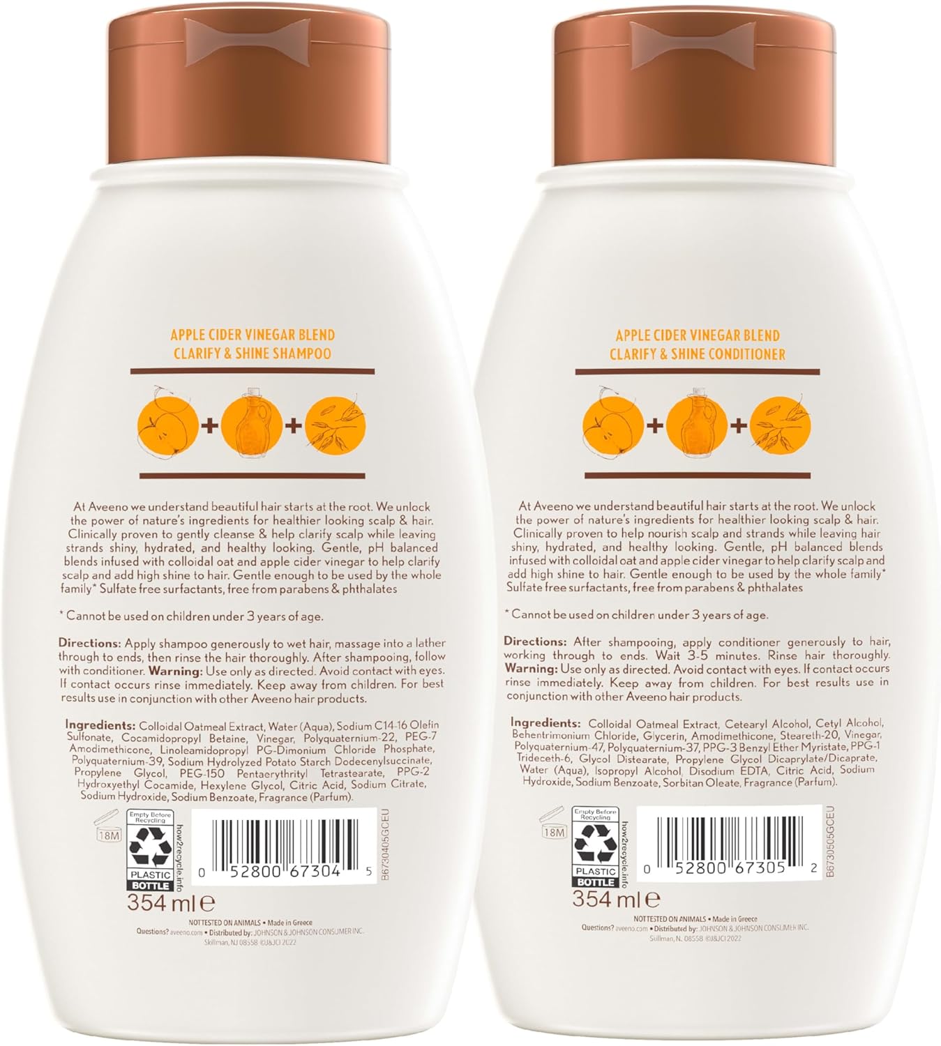 Aveeno Apple Cider Vinegar Shampoo + Conditioner for Balance & High Shine, Daily Clarifying & Soothing Scalp Shampoo for Oily or Dull Hair, Paraben & Dye-Free, 12 Fl Oz
