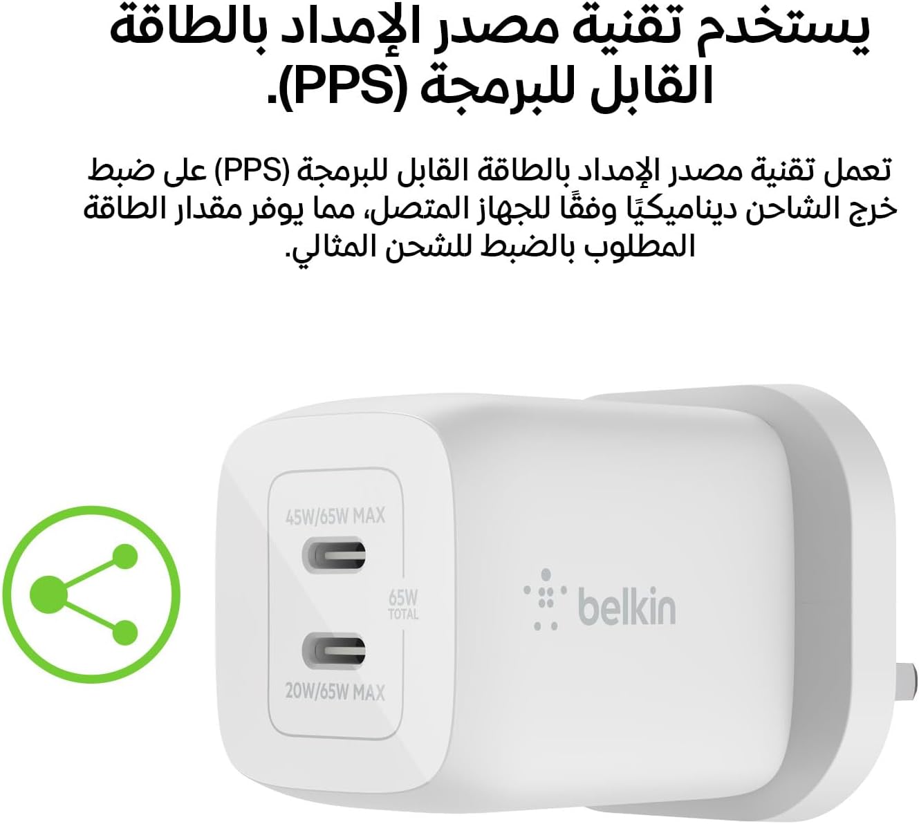 USB-C plug with integrated GaN technology provides a high-power, efficient charge that won’t overheat.PPS technology dynamically delivers optimum power to compatible devices.Charger plug with compact design ideal for home, office, or traveling