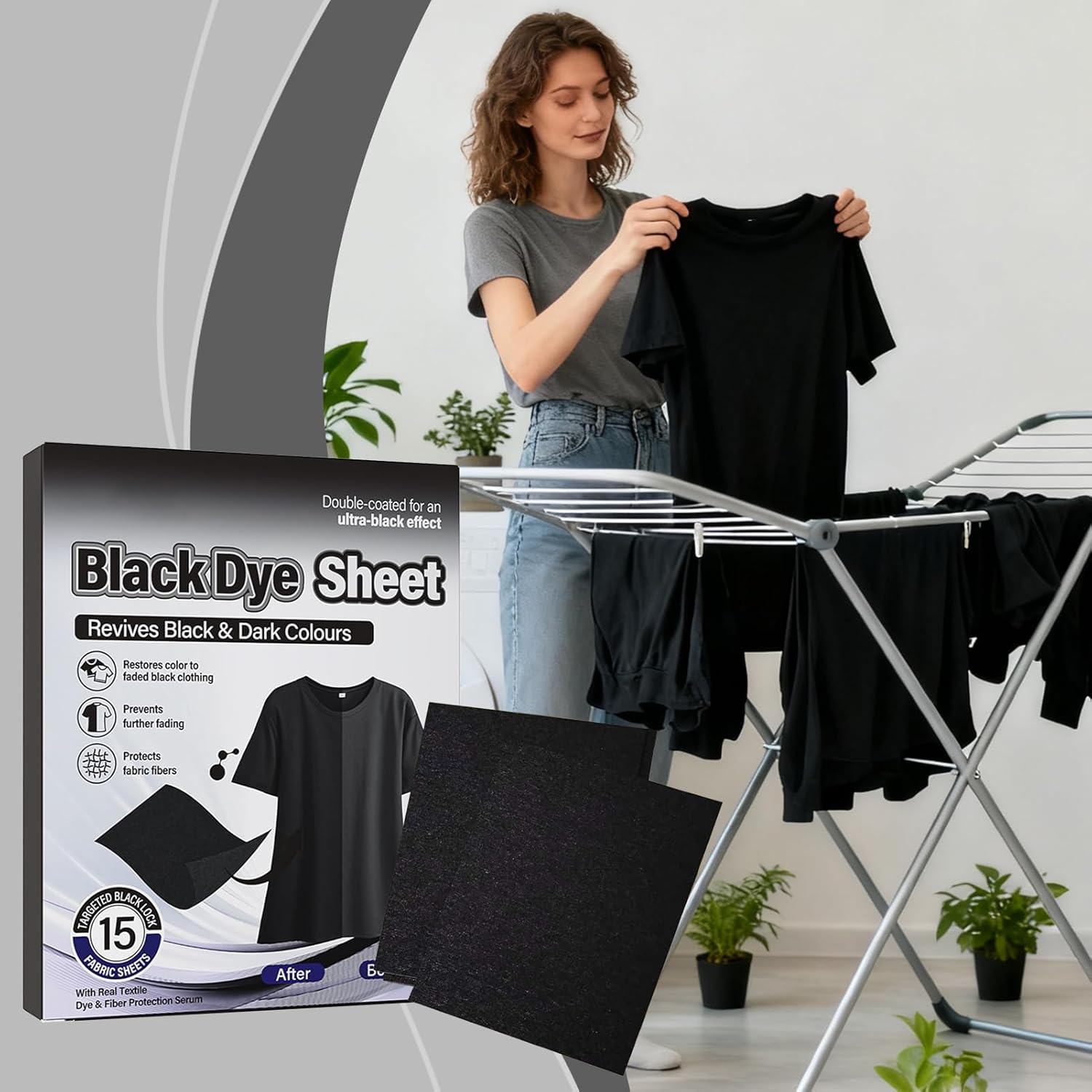 Black fabric color restorer sheets are an innovative solution for garment restoration and fabric care at home. This pack includes 15 pieces designed to revitalize faded black clothes, enhancing their appearance through effective washing. Acting as a dye booster, these sheets restore the deep richness of fabrics while providing maintenance during regular laundry cycles. Suitable for any standard washer, they simplify the process of clothing revitalization without additional effort. Ideal for maintaining the inherent beauty of your garments, this restorer ensures long-lasting results with minimal environmental effect. Use these sheets to keep your black fabrics looking vibrant and well-maintained effortlessly.