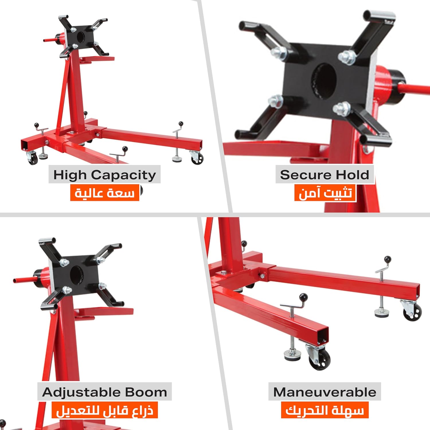 Secure Hold: Its height allows to position the engine at a comfortable working level. The secure mechanism holds the engine in place during work.
