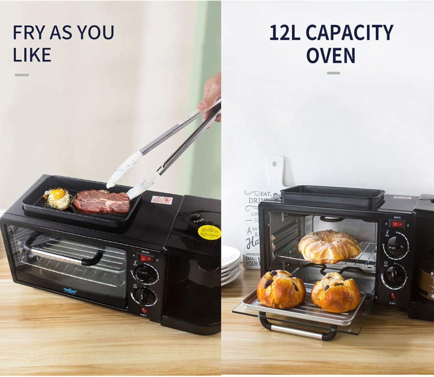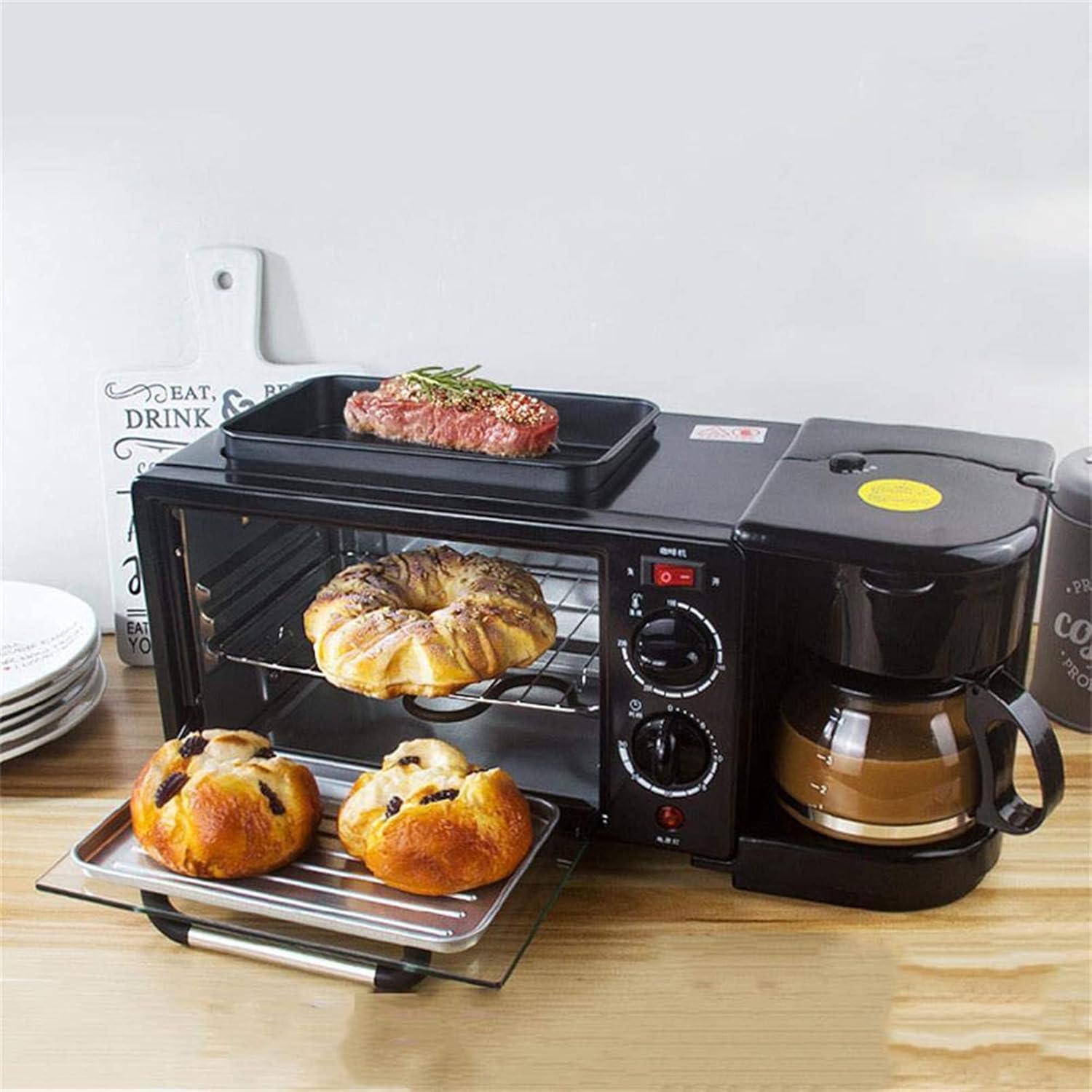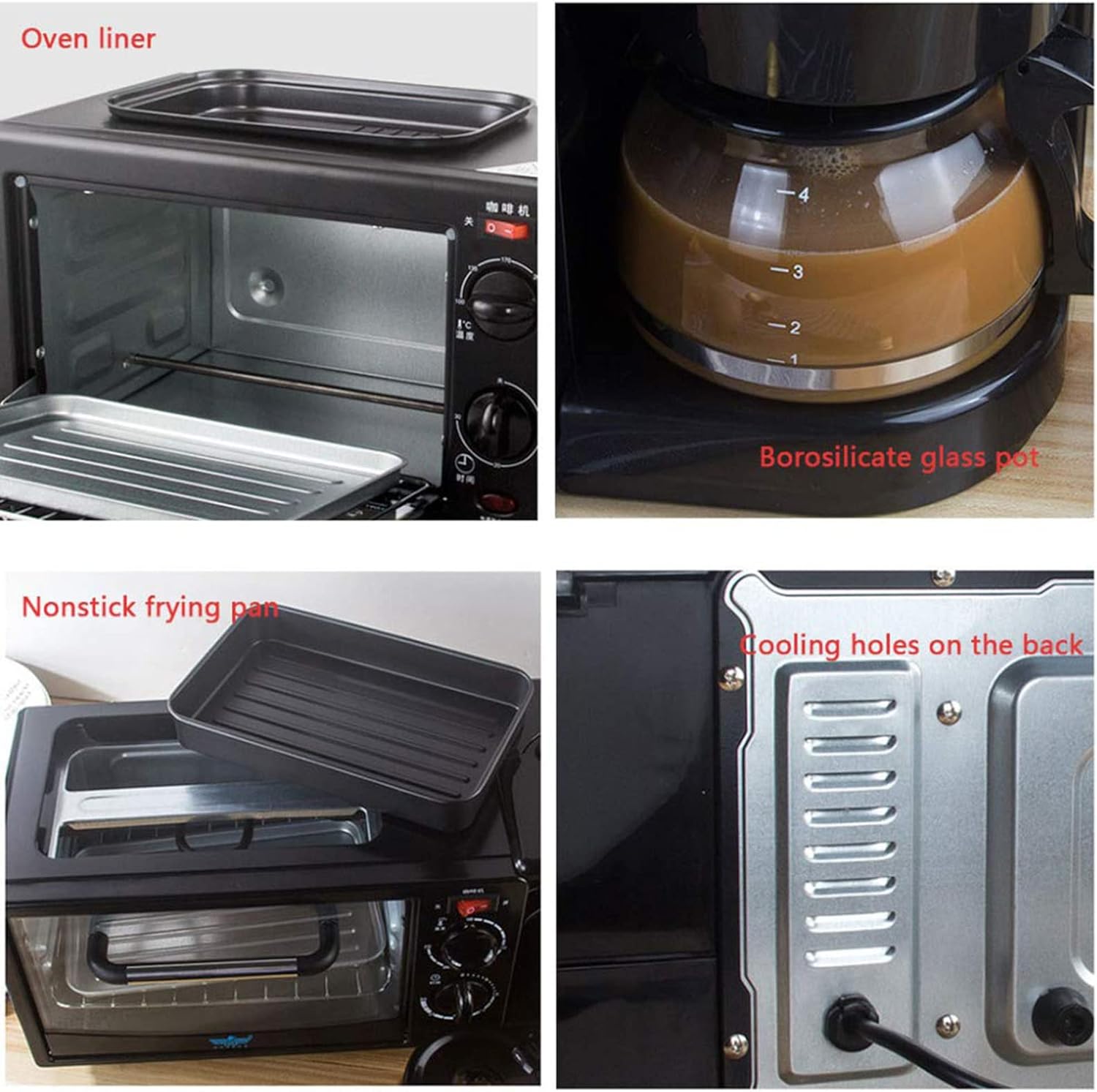 This multifunctional 3-in-1 breakfast machine can replace the oven, pan and coffee maker. ◆Function: heating, roasting, baking, boiled eggs, fried eggs. ◆The breakfast machine is very suitable for baking pizza, making toasted sandwiches for the whole family, and reheating leftovers. The perfect size fits your kitchen countertop. Cooking functions include keeping warm, baking, roasting, roasting, frying, and stewing. Specifications: Size: 50cm * 25.5cm * 22.5cm Oven capacity: 12 l Coffee machine capacity: 0.6 l Package includes: 1*Breakfast machine Customer Questions & Answers