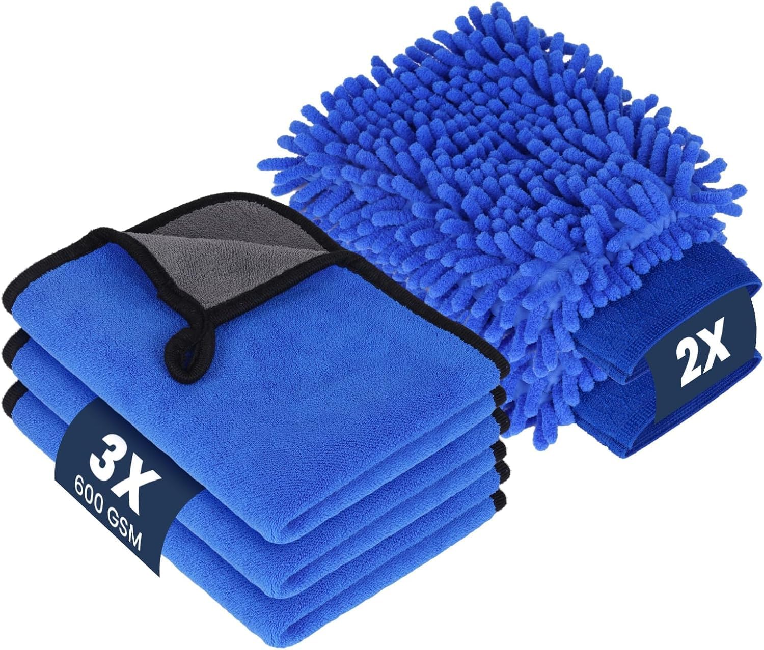 Car Wash Cleaning Tools Kit, 5 Pcs Car Cleaning Kit, Blue Cars Wash Kit with 3 Microfibre Cleaning Cloth and 2 Car Wash Mitt for Cars Washing, Care, Drying, Polishing