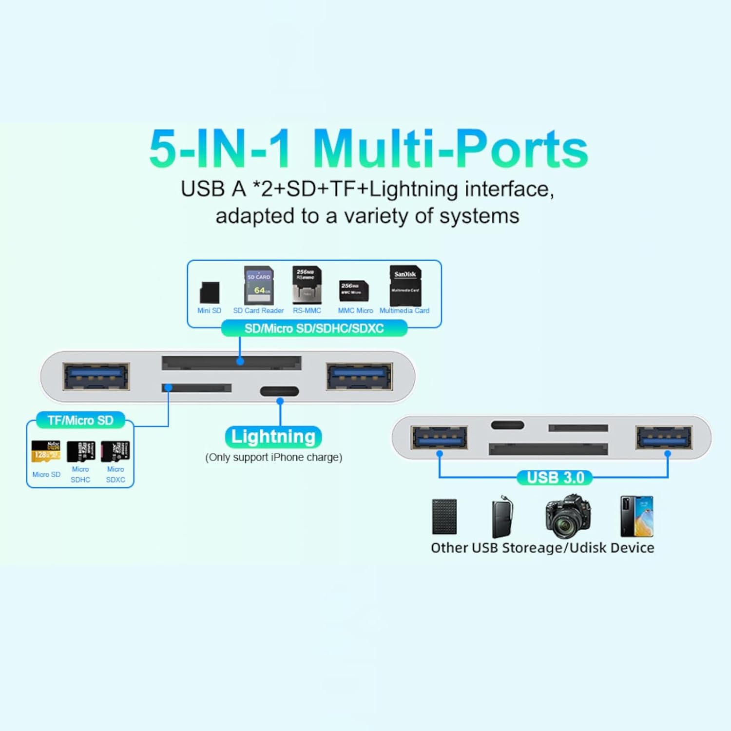 【Multi-function】: This 5 in 1 design SD card reader for iPhone/iPad include 1*SD Card port+1*Micro SD/T-Flash Card Reader port+1*USB Camera ports+1*3.5mm headphone jack port+1 * lightning charging port. Mouse/Keyboard/U-Disk+SD/TF card(256GB) makes your work more efficient. The 5 in 1 adapter not only has SD card reader, TF card iphone adapter, iphone to usb adapter function, but also iPhone charging interface, which can meet the needs in our life For various usage needs.