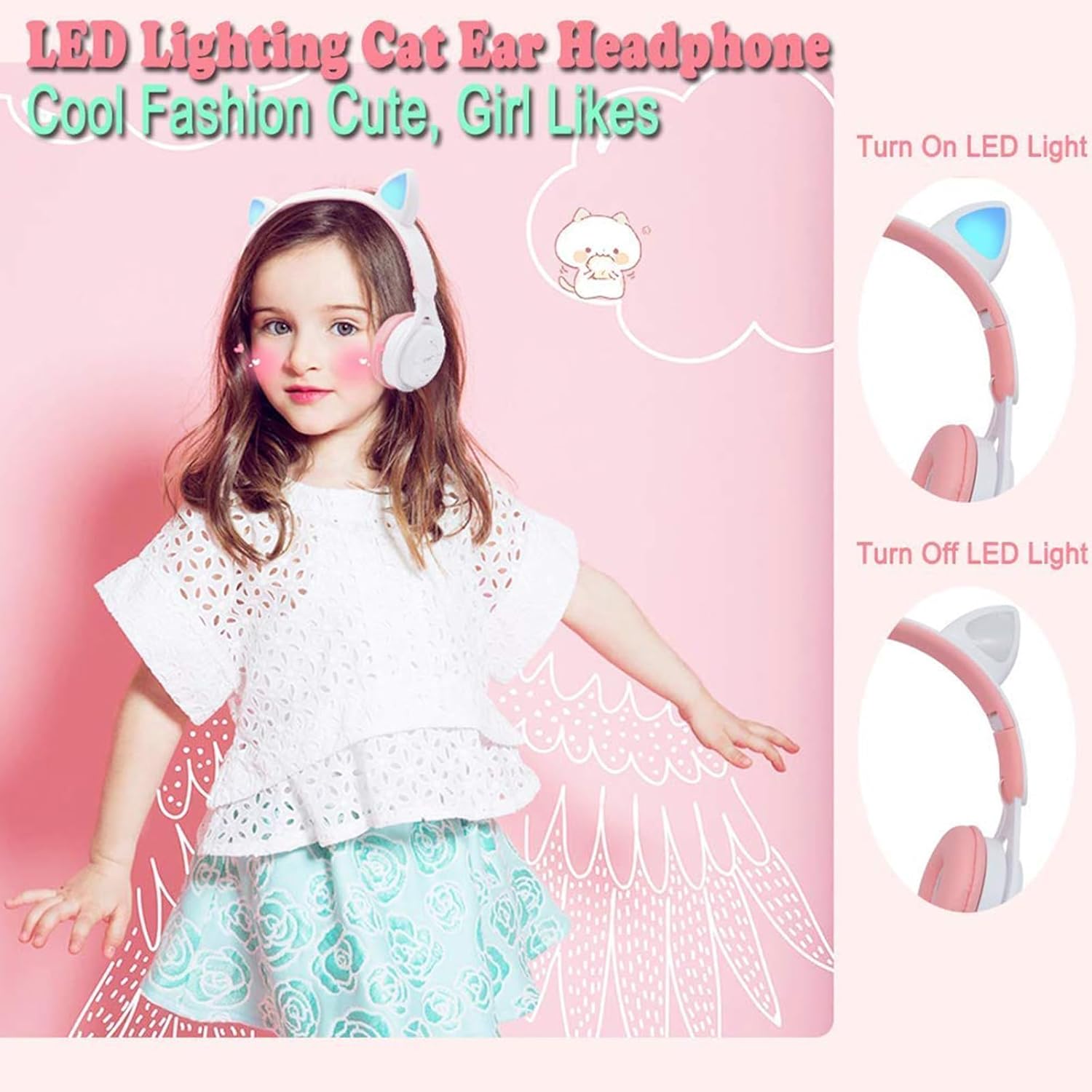Cat Ear Kids Headphones, Bluetooth 5.0 Cat Ear Headphone, Foldable Kids Bluetooth Headset, Over-Ear Wireless Headphones with Mic LED Light, Compatible with Smartphone, Pad, Lapto (Pink)