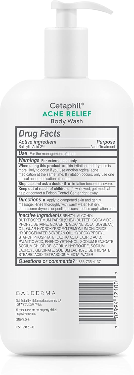 Cetaphil Body Wash, NEW Acne Relief Body Wash with 2% Salicylic Acid to Eliminate Breakouts, Gently Exfoliates and Provides 24Hr Dryness Relief, 20 oz