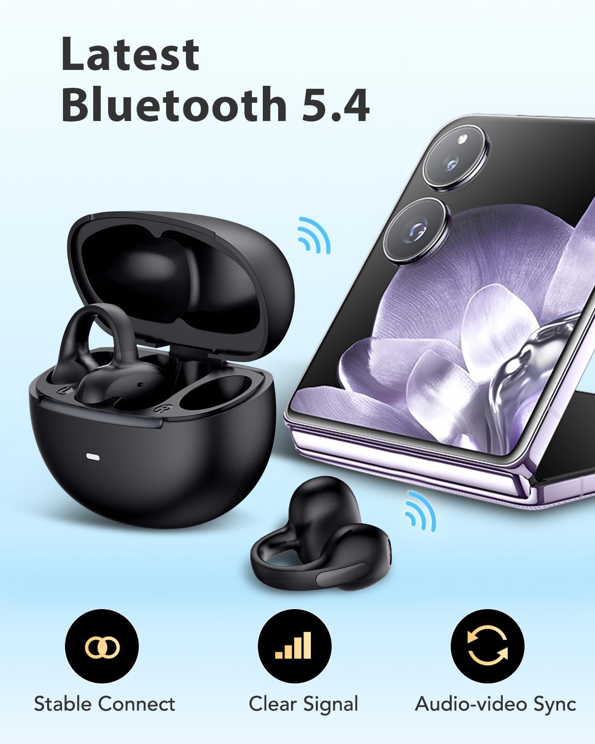 Clip on headphones Wireless Earbuds Bluetooth 5.4, Dynamic Drivers, Open Ear, Lightweight Comfort, 25 Hours Sports Earphones, Air Conduction Bluetooth Earbuds Compatible with iPhone & Android, Black