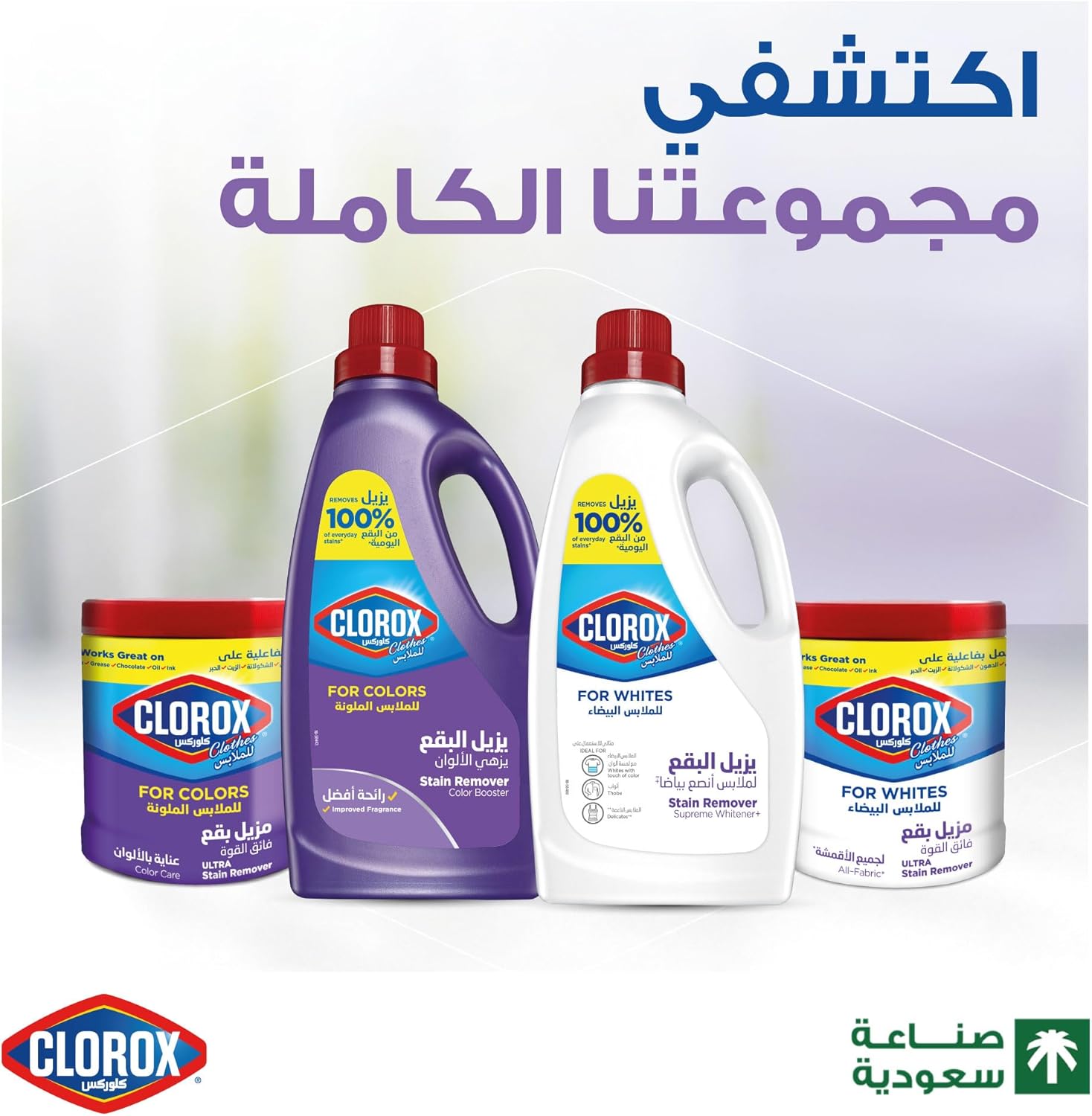 Always be sure to check the fabric care label and washing instructions. Use Clorox for colored clothes with your detergent to remove greasy stains as well as coffee, tea, ketchup and fruit juice. Removes 100% of everyday stains (tested on modern stains such as: tomato sauce, mustard, ink, fruit juices, coffee and tea. Pre-soak for better results). It is also safe for delicate washable fabrics such as silk, wool, and mohair. Clorox Color Clothing provides superior color care and prevents fading of your clothes. It enhances the effectiveness of the detergent and removes the toughest stains leaving your clothes looking flawlessly clean and bright. For instructions for use before washing, washing, soaking and for tough stains, please refer to the instructions for use on the label.