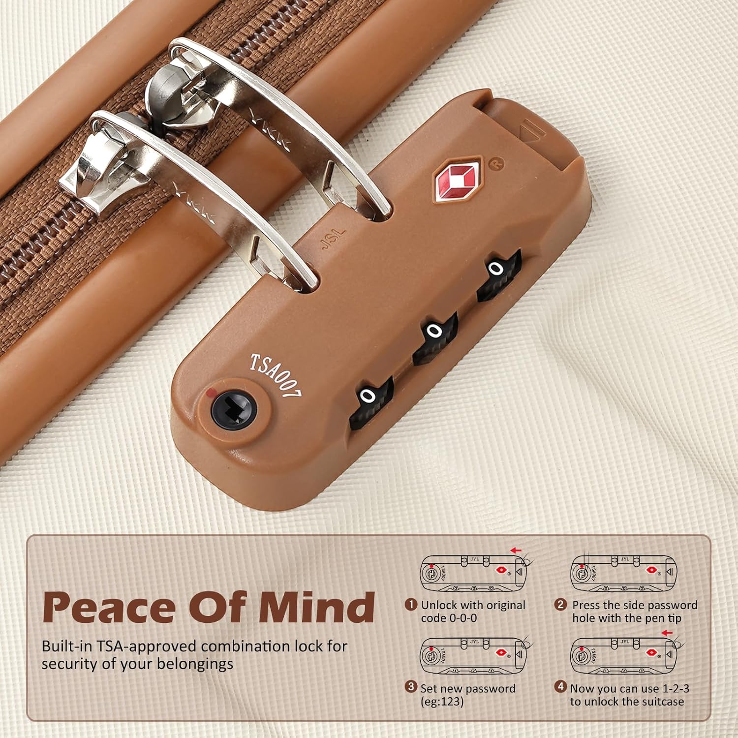 Secure & Convenient TSA Lock: Equipped with a TSA-approved lock, your belongings stay safe during international travel. Customs officials can inspect your luggage without damage, while you enjoy peace of mind. The ergonomic top and side handles ensure easy lifting, and the built-in side feet of the carry on luggage allow stable stacking. No more wobbling or tipping—just smooth, hassle-free transit.