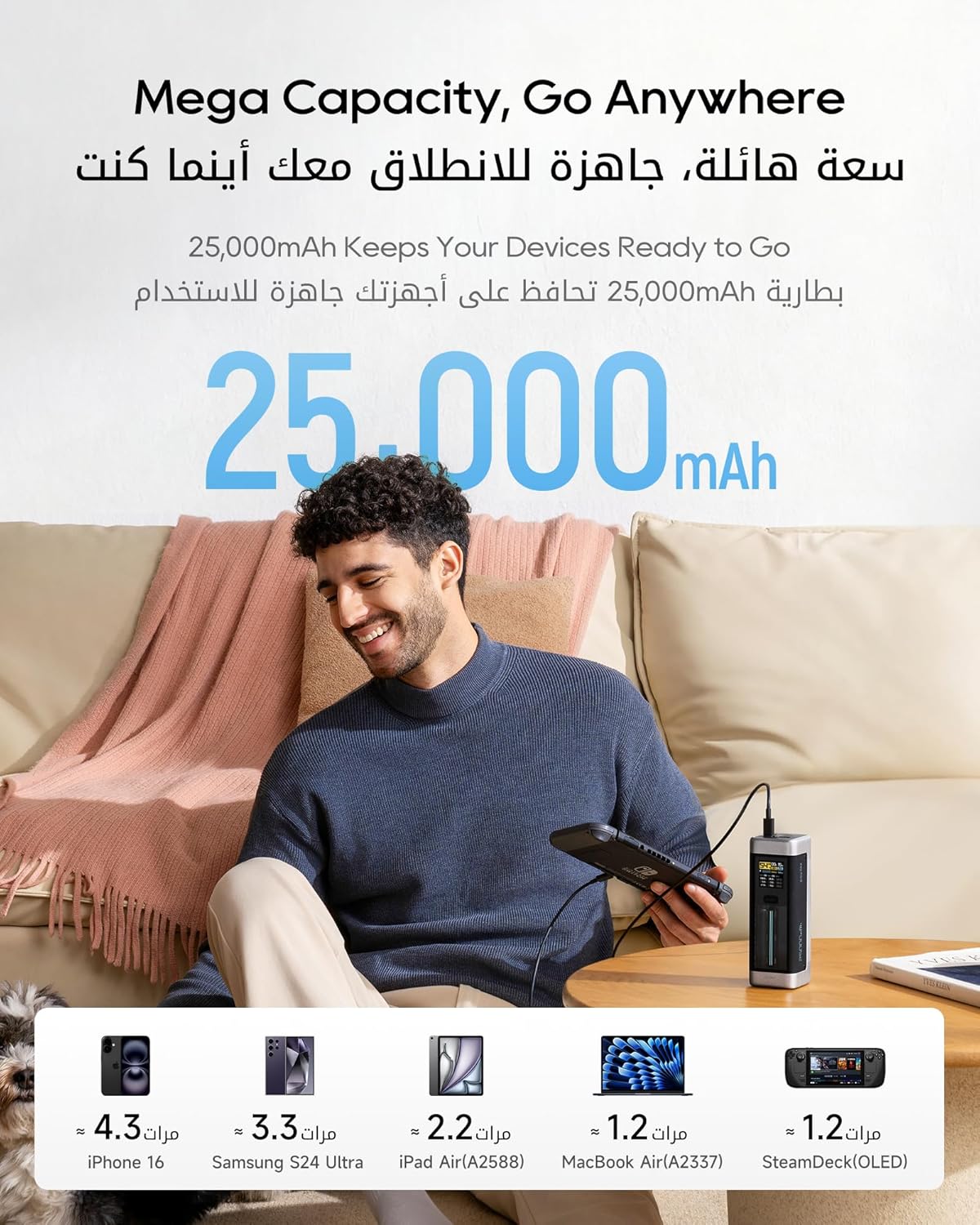 High Capacity, Travel-Ready: With a massive 25,000mAh (90Wh) battery, this portable charger keeps you connected, charge your iPhone 17 Series up to 4 times or a MacBook Air 1.2 times on a single charge. Perfect for travel, outdoor adventures, and emergencies.