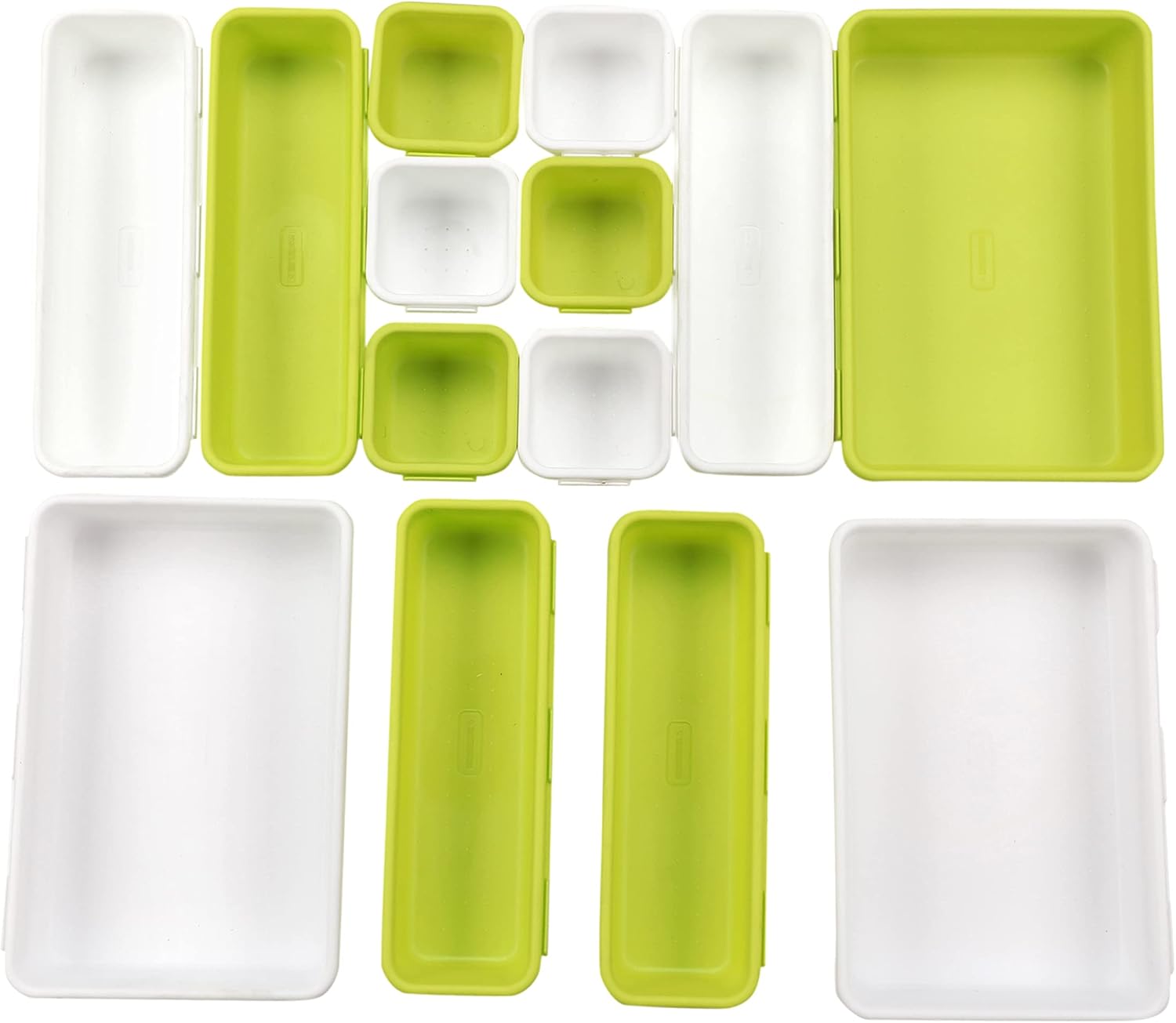 Cutting EDGE Interlocking Drawer Organizer Set of 14, Divider/Separator White & Green Plastic Trays for Flatware, Cutlery & Desk Storage for Household, Kitchen & Office
