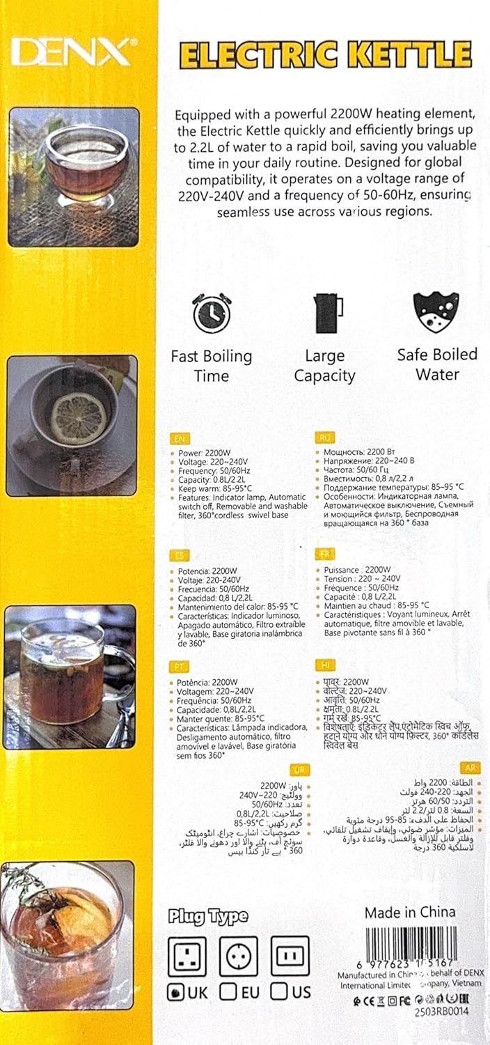 The DENX Stainless Steel Double Kettle DX3802 is a powerful and versatile electric kettle designed for fast boiling, tea making, coffee brewing, and everyday hot water needs. With a 2200W high-performance heating system, it quickly heats up to 2.2 liters of water in minutes, making it the perfect tea kettle, coffee kettle, hot water boiler, soup kettle, or instant drink maker for homes, offices, and student dorms. Featuring a dual pot design (2.2L + 0.8L), this stainless steel kettle includes a removable filter for brewing tea, preparing coffee, herbal drinks, and keeping hot water ready for daily use. The boil-dry protection, automatic shut-off, overheat prevention, and LED indicator ensure safe and reliable operation, making it a trusted choice for family kitchens, office pantries, and gatherings. Built from durable stainless steel, this electric jug kettle is rust-resistant, easy to clean, and designed for long-lasting use. Its cordless 360-degree swivel base allows easy handling and pouring from any angle, making it convenient for both left-handed and right-handed users. The ergonomic anti-scald handle and one-touch lid opening provide extra comfort and safety during daily use. For added convenience, the keep warm function (85–95°C) maintains water temperature for tea, green tea, black tea, coffee, instant noodles, oatmeal, baby formula, and other hot beverages without the need to re-boil—saving time, energy, and electricity. This makes it not only a fast boil kettle but also an energy-efficient kitchen appliance suitable for families, students, restaurants, and office break rooms. The DENX DX3802 double electric kettle is the ultimate choice for those who want a modern, reliable, and multi-purpose kettle for quick boiling, brewing, and hot drink preparation. Whether you need it for everyday household use, hosting guests, or as a travel-friendly hot water dispenser, this kettle delivers both style and performance.