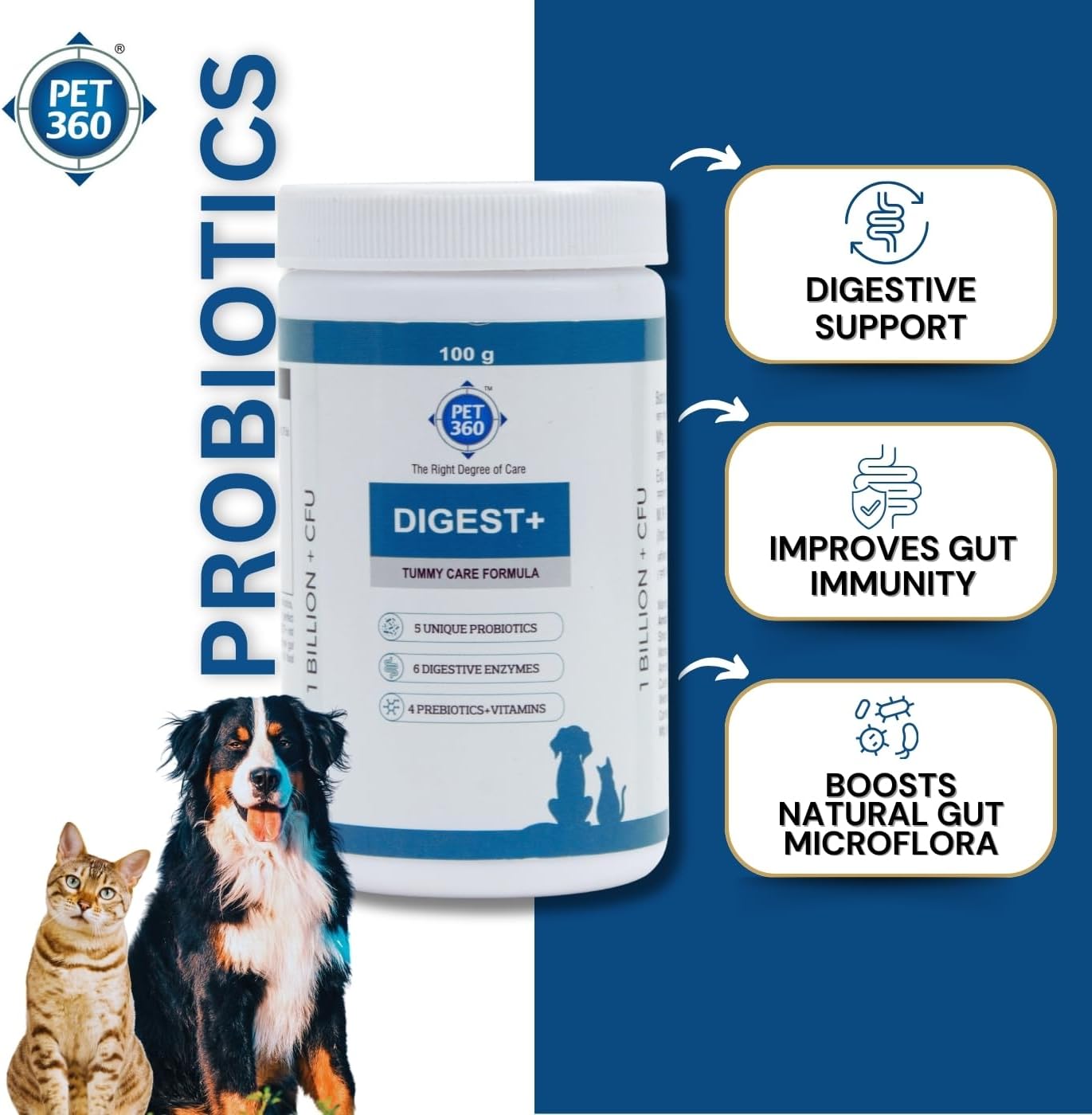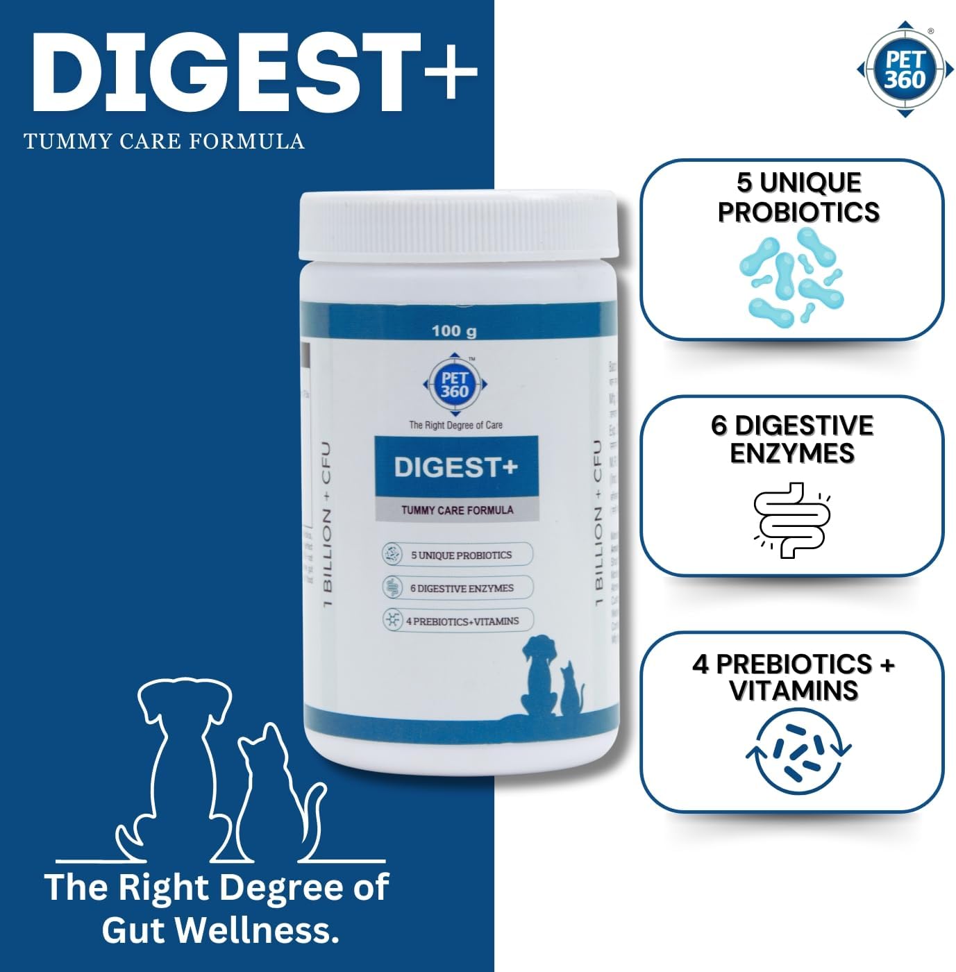 Digest+ Tummy Care Formula | Gut Health Supplement for Dogs & Cats | Probiotics, Prebiotics, Digestive Enzymes & Vitamins for Improved Digestion & Immunity | Suitable for All Breeds – 100 gm