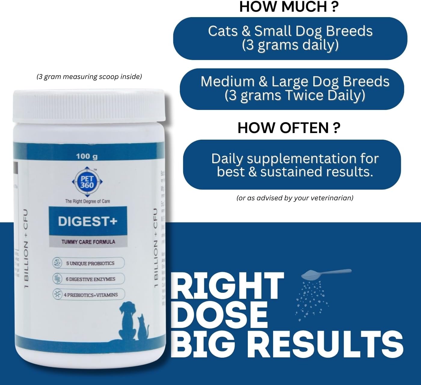 ENHANCES DIGESTIVE HEALTH: PET360 DIGEST+ Tummy Care Formula is an ideal gut health supplement powder for pets, featuring a powerful blend of probiotics, prebiotics, digestive enzymes, and vitamins. This formulation promotes healthy digestion, relieves from stomach discomfort and enhances nutrient absorption for pets.