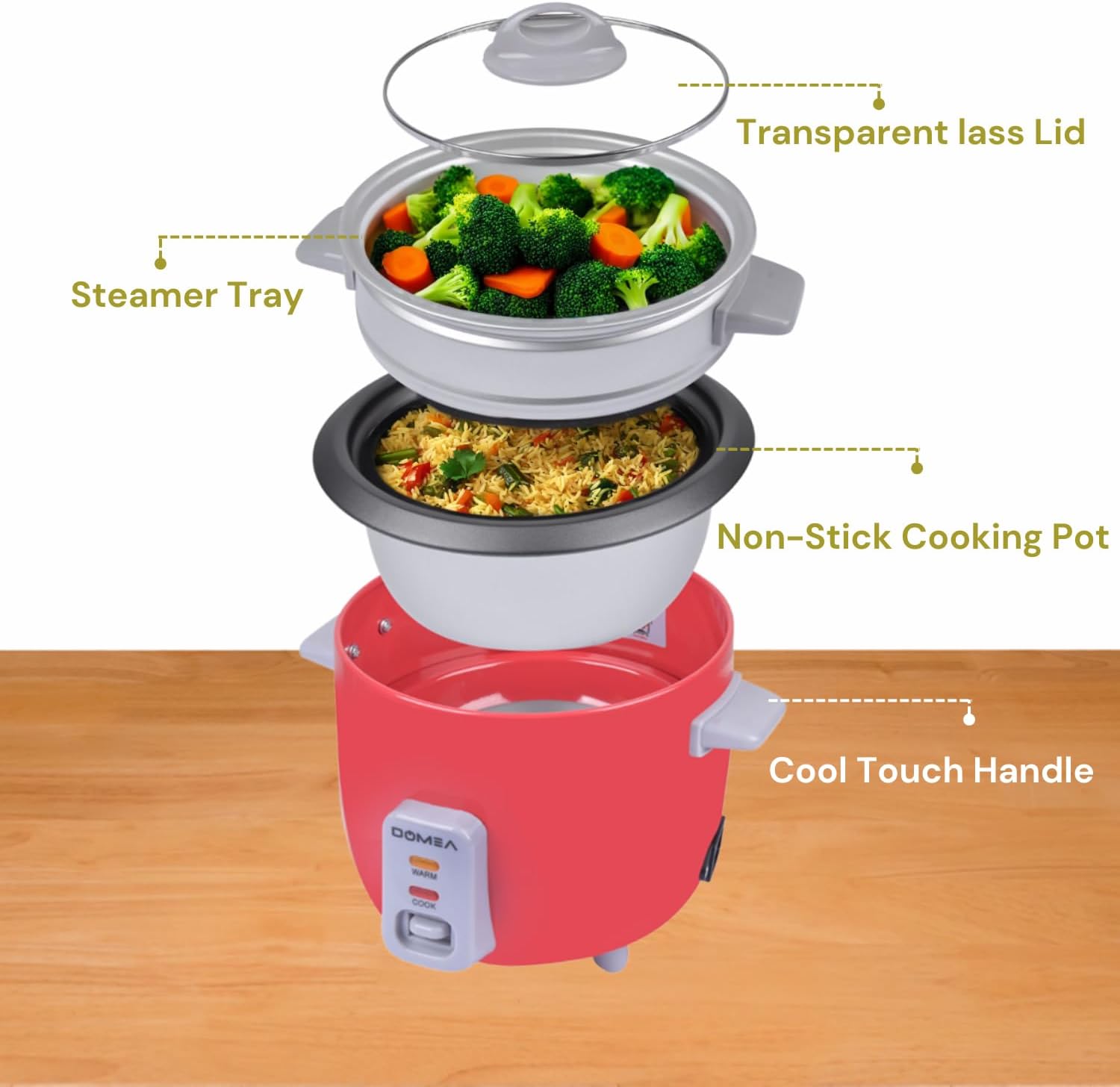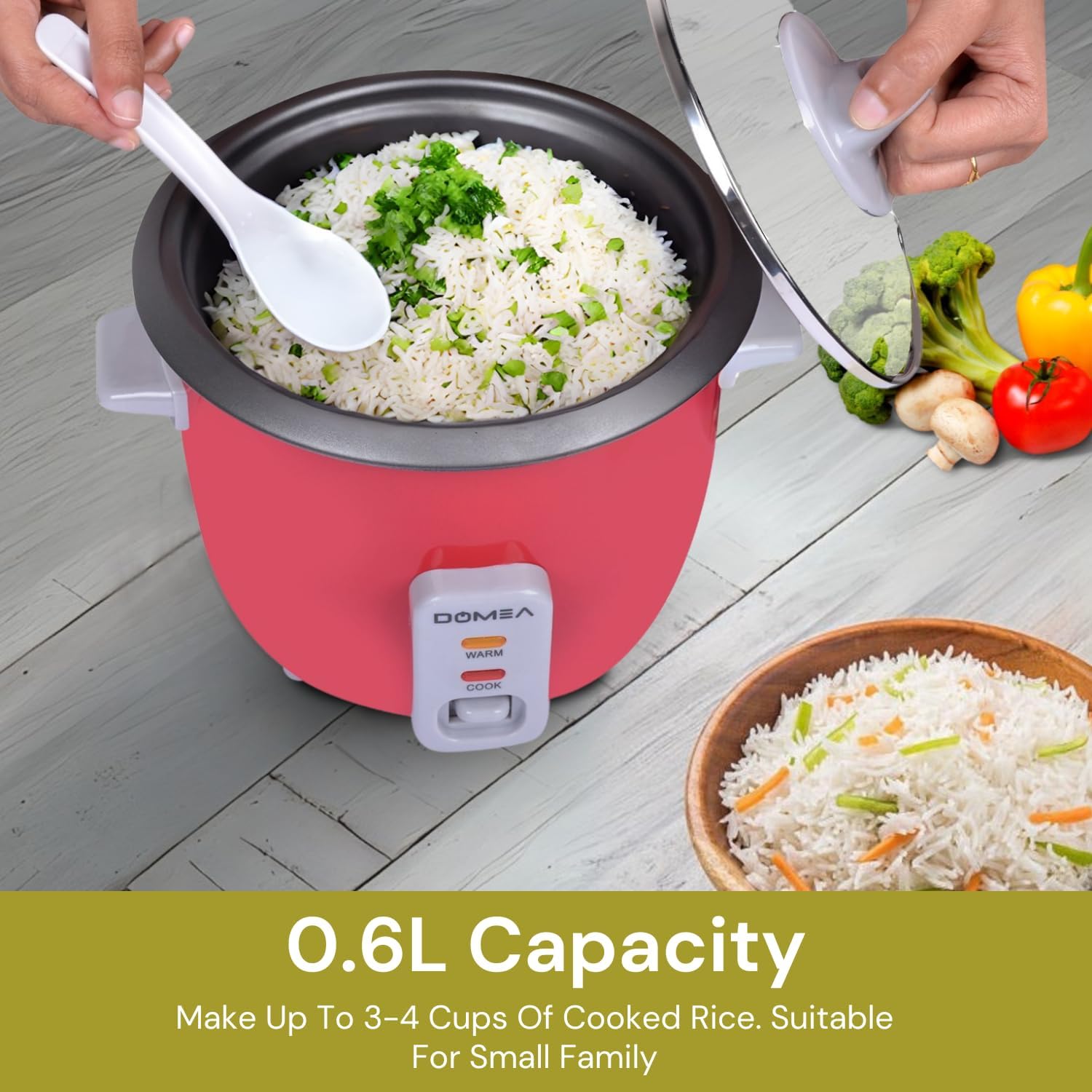DOMEA 0.6L Electric Rice Cooker Small, Cook, Steam, Warm 3-in-1 Functions, 350W, Tempered Glass Lid, Non-Stick Inner Pot, Extendable Steam Tray for Veg/Fish/Poultry, Ideal for Small Kitchens