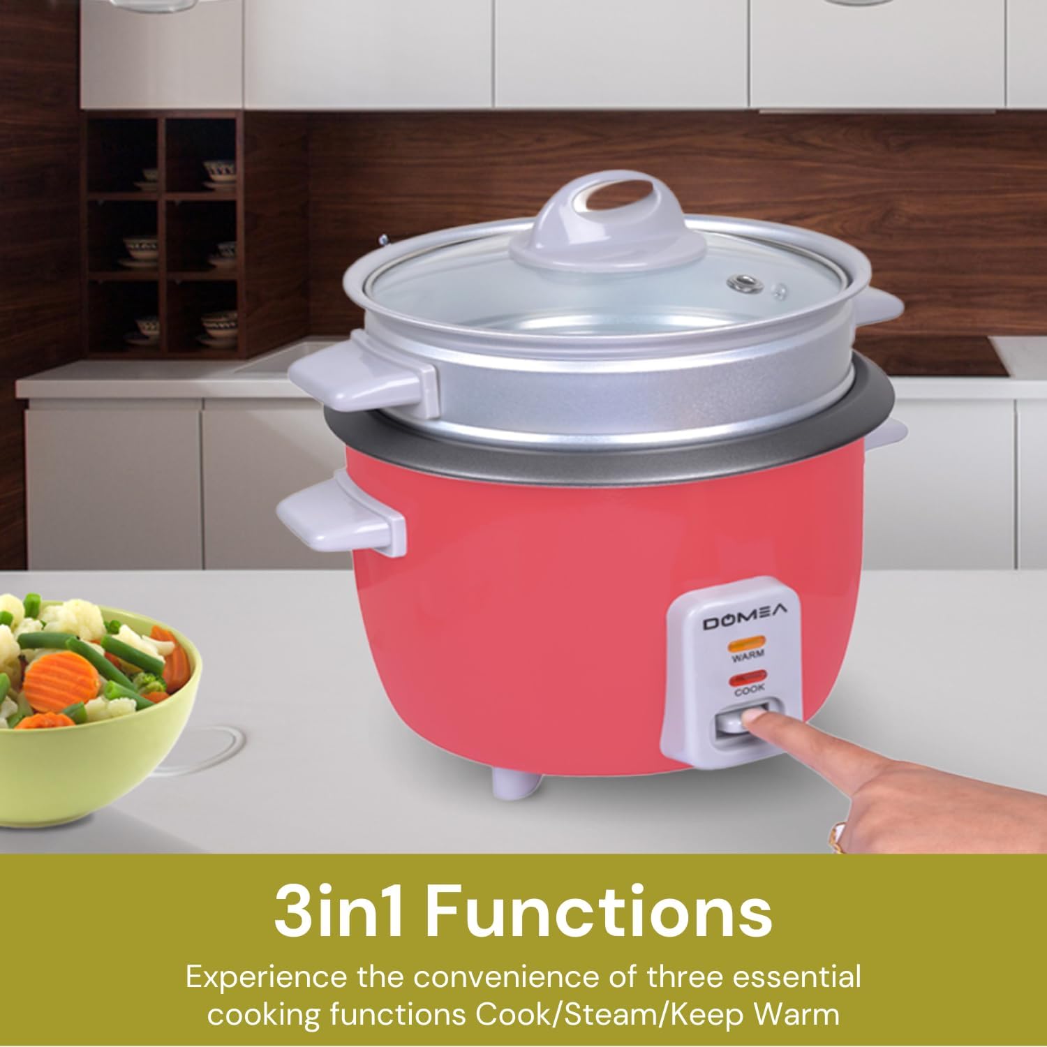 3-IN-1 VERSATILITY: Cook rice, steam vegetables, fish, or poultry, and keep your food warm with this compact and efficient appliance.