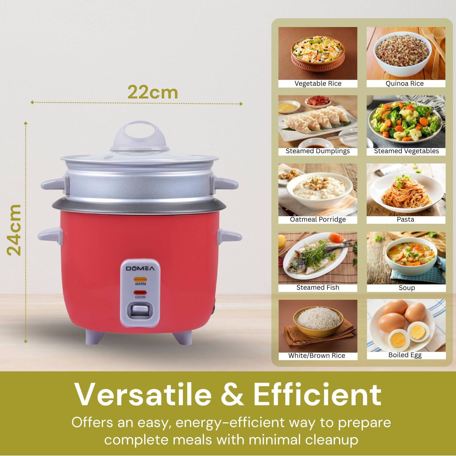 Be the first to review “DOMEA 0.6L Electric Rice Cooker Small, Cook, Steam, Warm 3-in-1 Functions, 350W, Tempered Glass Lid, Non-Stick Inner Pot, Extendable Steam Tray for Veg/Fish/Poultry, Ideal for Small Kitchens” Cancel reply