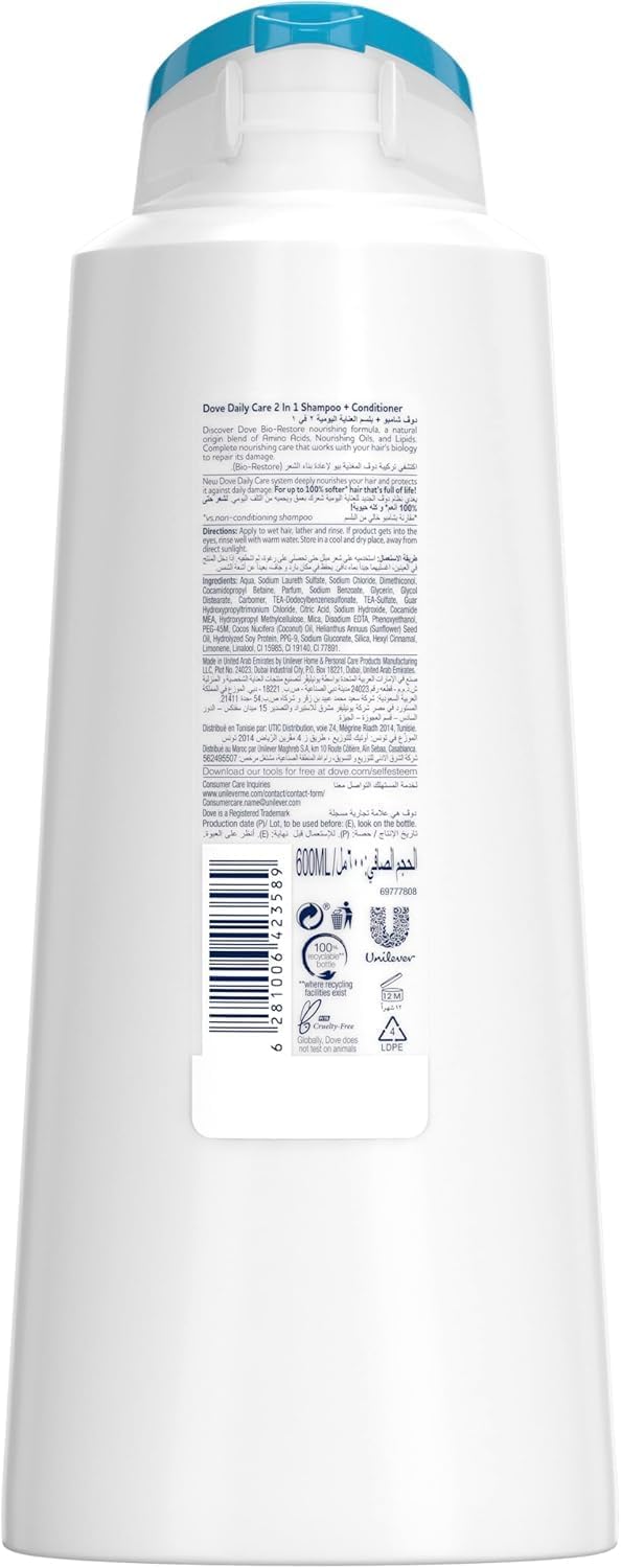 We all love the feeling of soft, silky hair, but with a busy life, we need to get this faster. A conditioning shampoo can help protect your dry hair from the daily wear and tear of life, leaving it feeling soft and easy to style. That’s why we’ve developed Dove Daily Care 2 in 1 Shampoo; a shampoo and conditioner formula to help give you smooth, silky hair, every day. New Dove Daily Care 2 in 1 shampoo and conditioner deeply nourishes your hair and protects it against daily damage. For up to 100% softer* hair that’s full of life! Formulated with Dove’s next generation nourishment hair care system, Dove Bio-Restore formula, a natural origin blend of Amino Acids, Nourishing Oils, and Lipids, it works with your hair’s biology to repair its damage from inside out, for complete, nourishing care. Directions: Apply to wet hair, lather and rinse. If product gets into the eyes, rinse well with warm water. Store in a cool and dry place, away from direct sunlight. For best results, after shampoo, style with Dove Oil Replacement Cream.