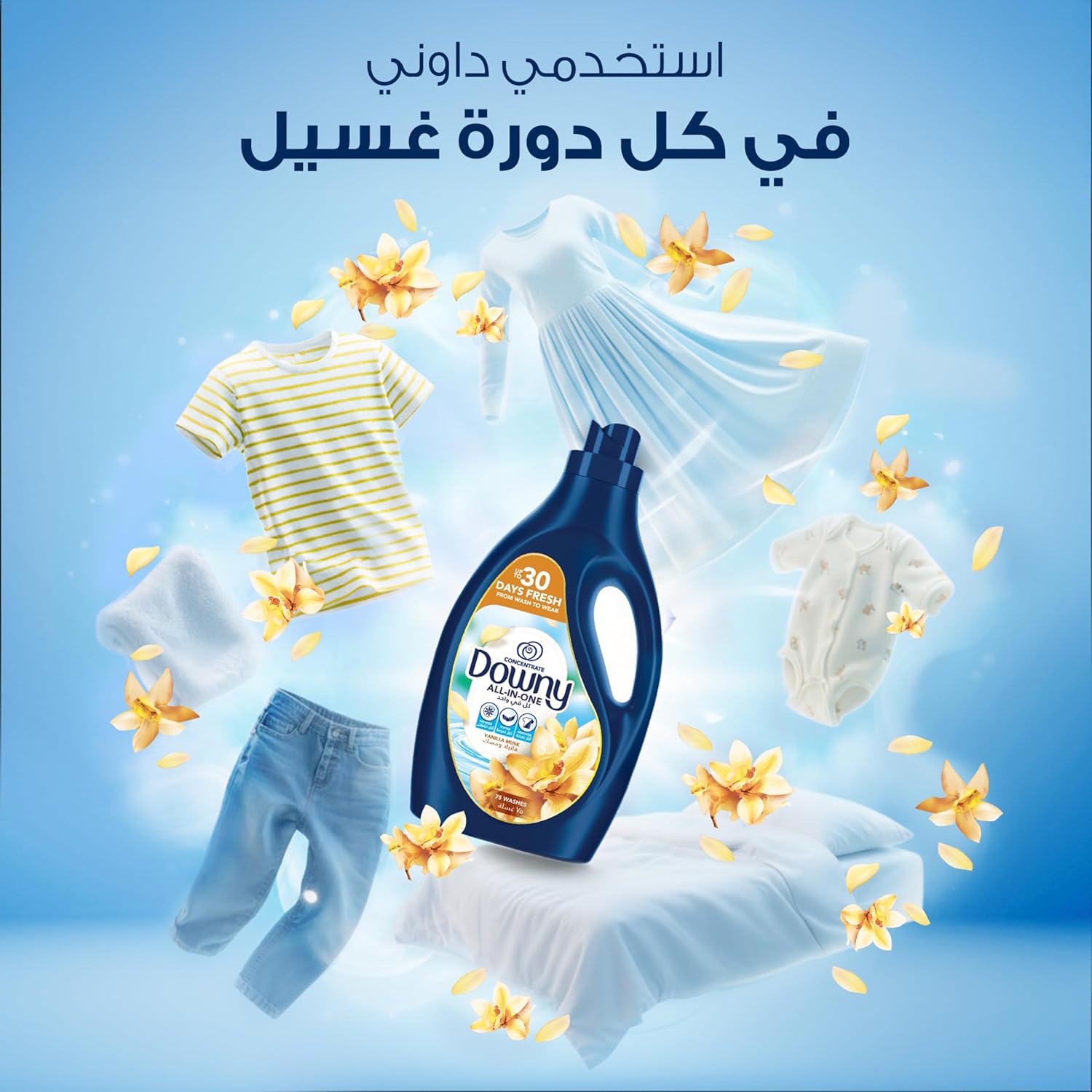 Introducing Downy All-in-One Fabric Concentrate Softener: Experience Up to 30 Days of Lasting Vanilla & Musk Freshness! Tired of fleeting freshness? Elevate your laundry game with Downy All-in-One, the ultimate fabric softener that ensures your clothes stay fresh, soft, and beautifully cared for—long after the wash. Imagine the joy of opening your wardrobe and being greeted by the delightful scent of your favorite fabrics, long after they’ve been washed. Downy All-in-One is here to make that dream a reality. With our innovative formula and perfurme micro capsule technology, you’ll never have to compromise on freshness again. It’s not just about a moment of pleasant aroma; it’s about embracing a new standard of fabric care that keeps your clothes smelling fresh, soft, and vibrant for a full month.