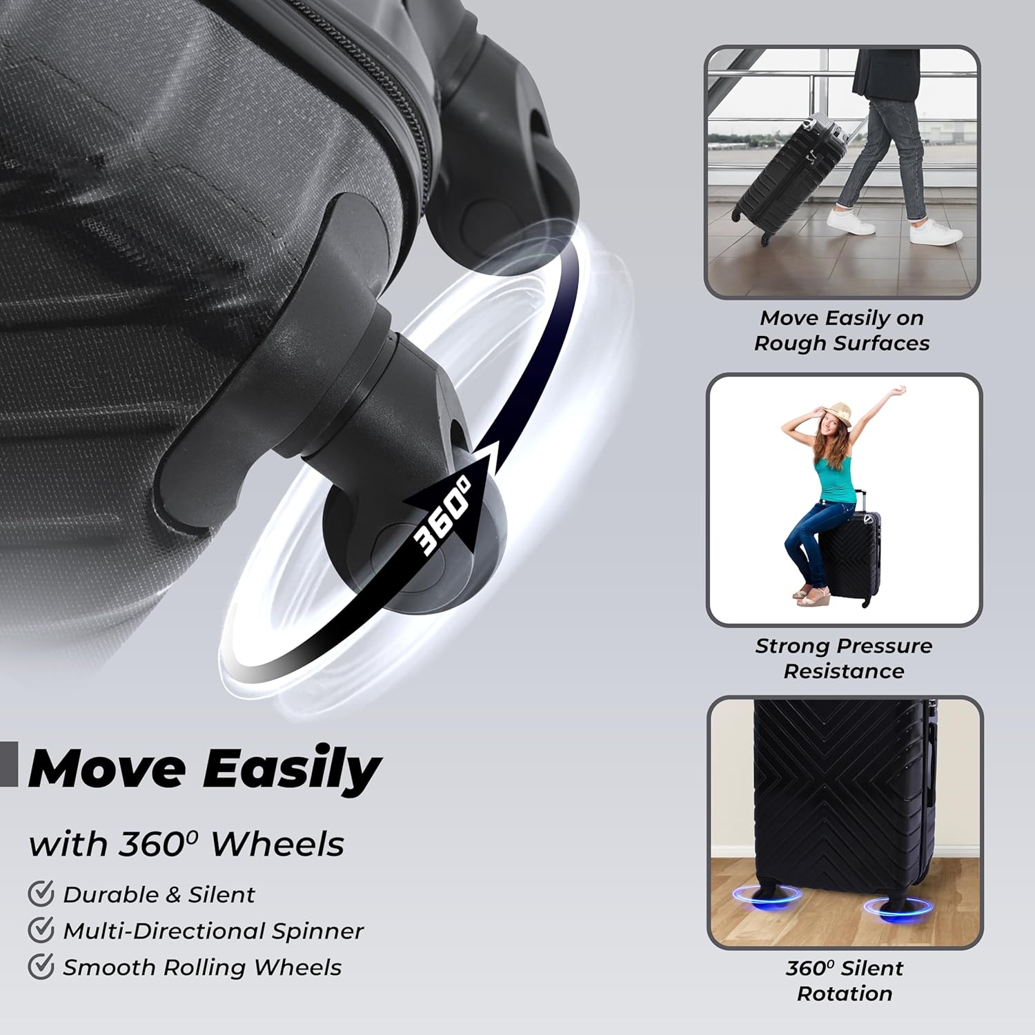 Durable Material & Smooth Mobility: Made from high-quality ABS, and polycarbonate, offering a perfect blend of durability and lightweight protection for your belongings. Features single 360-degree spinner wheels for effortless maneuverability in any direction.