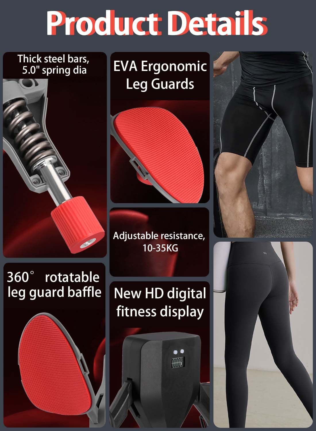 The 360° rotatable baffle is convenient for you to use it in any orientation, you can choose your favorite posture, complete the leg exercise you want.Adjustable spring tension, you can choose your own strength according to your own situation, which is very important for long-term exercise.The design is small and easy to store. You can take it with you at any time and anywhere for exercise.This thigh trainer caters to all fitness levels. With adjustable resistance ranging from 10-35kg.