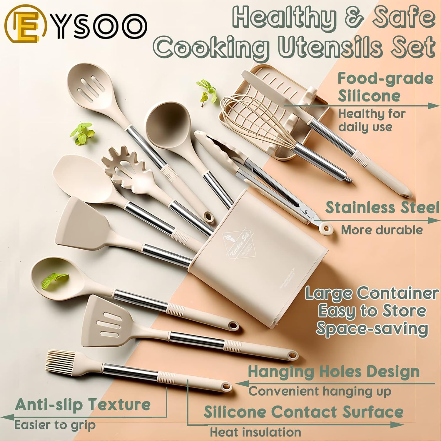 Home Home & Kitchen EYSOO Kitchen Cooking Utensils Set 34 Pcs Silicone Kitchen Gadgets Tools Set with Holder for Non-stick Cookware Heat-resistant Silicone Spatula Tools Set with Stainless Steel Handle (Khaki)