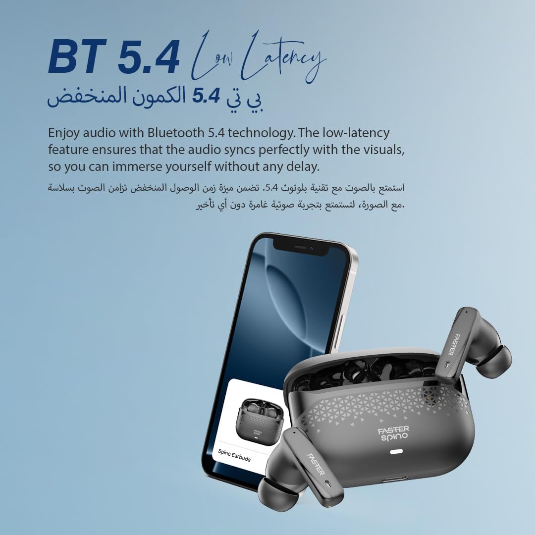 Spino: Let The Beat Rule. Sound That Awakens The Senses Unleash the beat with the Faster Spino Wireless Earbuds, designed for those who want power, clarity, and convenience in every note. The Faster Spino wireless earbuds feature faster transmission speeds, a more stable signal connection, and no delay. Whether you’re at the gym, playing sports, running, or doing yoga, you won’t lose the signal or have your music interrupted. After the first pairing, simply take the Bluetooth earbuds out of the charging case to connect immediately, with a range of up to 10 meters. Powered by Bluetooth 5.4+EDR, Spino provides stable, instant connections with zero lag, whether you’re working out, at work, or relaxing. The ENC noise cancellation ensures crystal-clear calls, cutting through background noise so your voice is always heard. Experience music like never before with 10mm dynamic drivers, deep bass, balanced mids, and crisp highs. With low-latency mode, every movie, video, or game syncs perfectly with sound for total immersion. Stay in control with smart touch gestures and hands-free voice assistant support. Plus, with 5 hours of playtime per charge and up to 150 hours of standby, your earbuds are always ready when you are. Type-C fast charging means less waiting, more playing. The faster Spino wireless earbuds offer quicker transmission speeds and a more stable signal connection, with no delays. Whether you’re at the gym, playing sports, running, or practicing yoga. You won’t experience signal loss or music interruptions. After the initial pairing, simply remove the Bluetooth earbuds from the charging case for an instant connection, and the connection range extends up to 10 meters. These wireless Bluetooth earbuds feature a high-quality 10mm driver that delivers impressive low-frequency depth, balanced mid-range, and clear high-frequency audio, bringing every note and detail to life and greatly enhancing your listening experience. Our earphones let you enjoy your personal music moments indoors, outdoors, while working, or exercising. The in-ear design includes smart touch controls, allowing you to easily play or pause, answer or reject calls, hang up, skip to the previous or next song, or activate voice assistants, without needing to operate your phone. These Bluetooth earbuds are compatible with Bluetooth 5.4 including phones and tablets for Android and iOS.