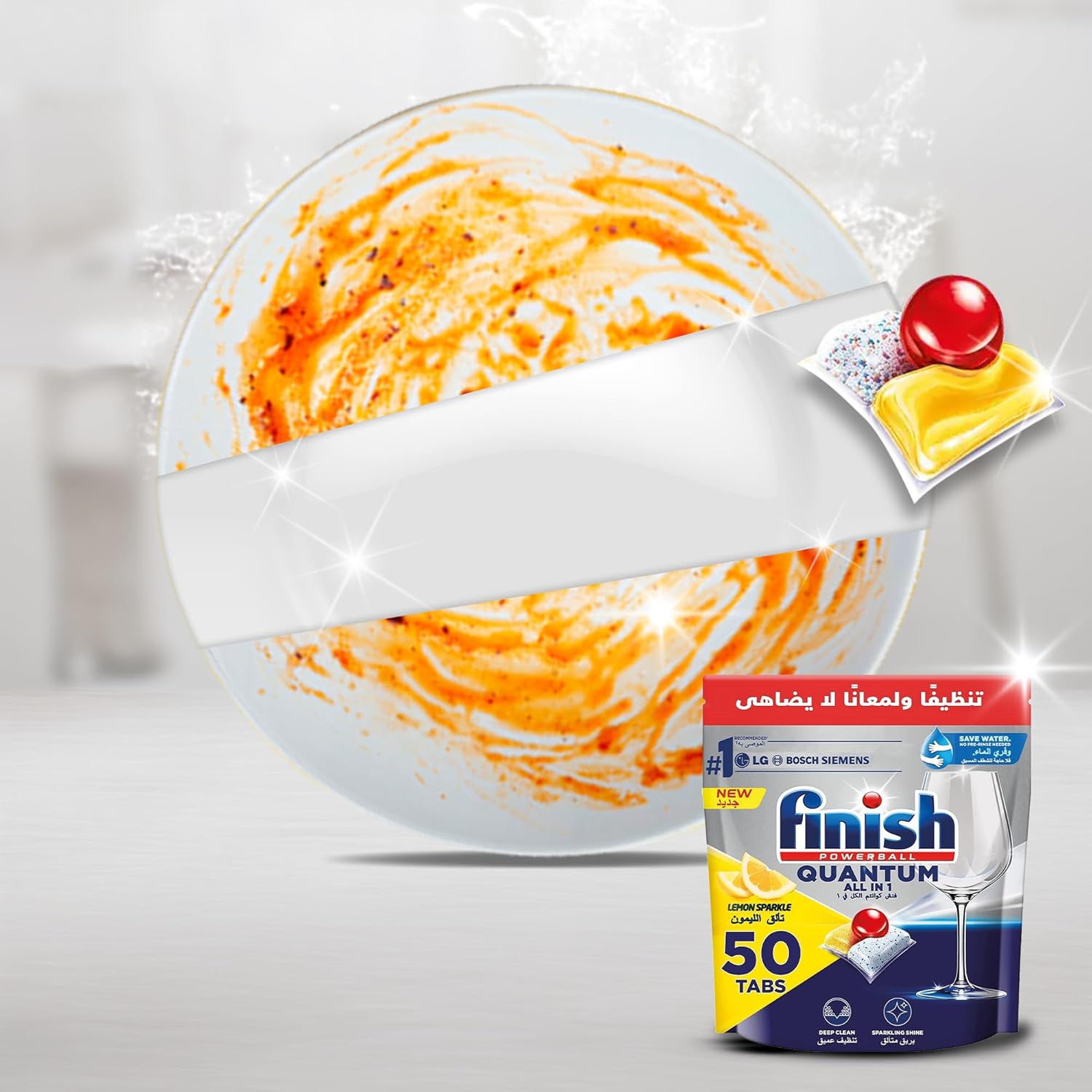 Finish Powerball Quantum Lemon Sparkle All In 1 Dishwasher Tablets helps to remove the toughest messes and stains. Stack up your kitchen with clean and shiny dishes without the hassle of pre-rinsing them. Make Finish Powerball Quantum your everyday dishwasher partner as it gives your dishes deep clean and sparkling shine 1st time, every time. The powerful 3-chamber chemistry of dishwasher tablets is effective at breaking down all types of food residues even without pre-rinsing. Pack contains 90 tablets.