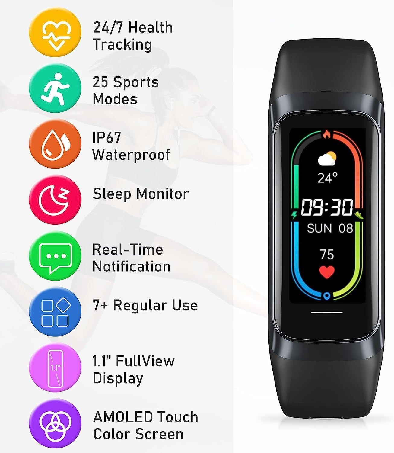 1.10” AMOLED clear display smooth experience, bezel-less full-colour display delivers vivid visuals,the screen ratio increased by 42%,making it clearer and more convenient for you to use.