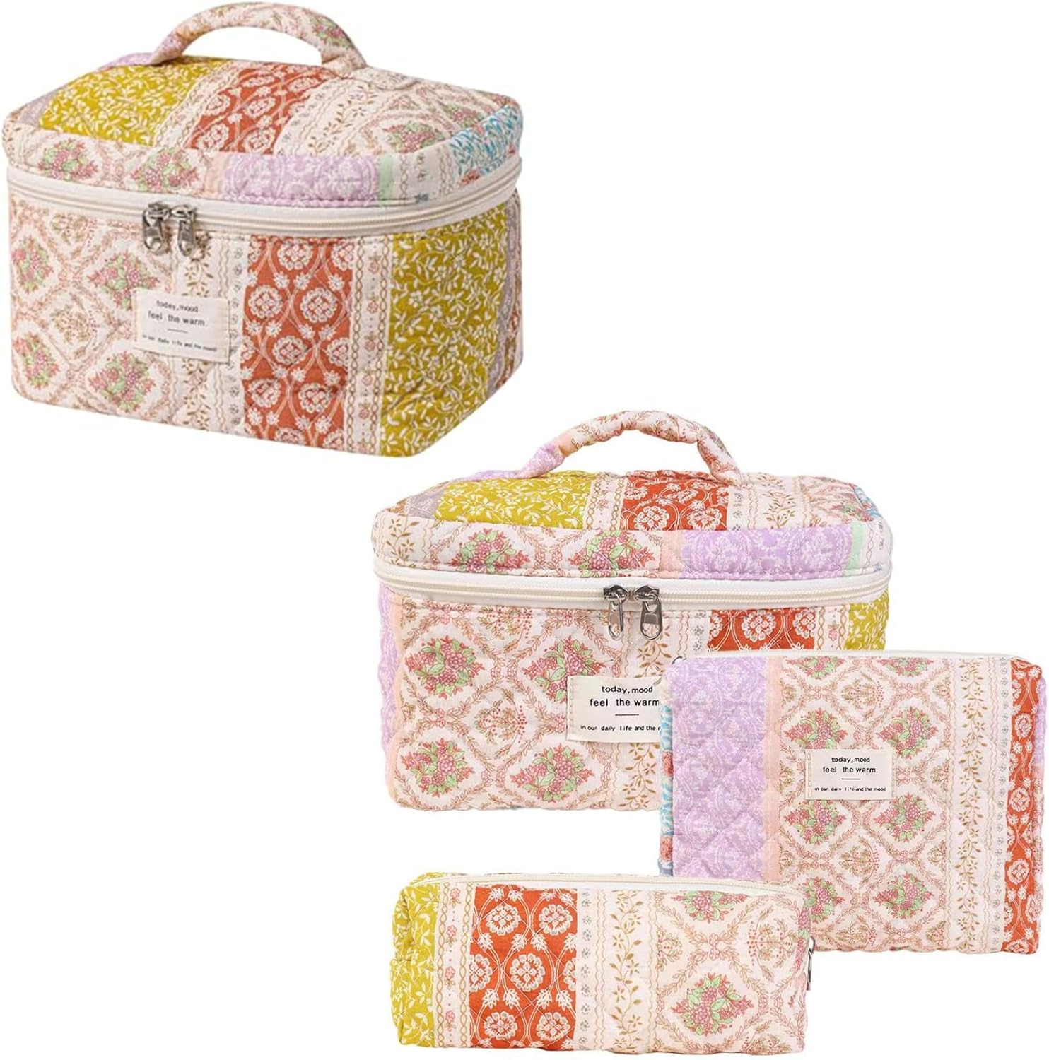 Floral Makeup Bag Large Capacity Lightweight Soft Cotton Quilted Makeup Bag Foldable Zippered Cute with Handle, Portable Cosmetic Quilted