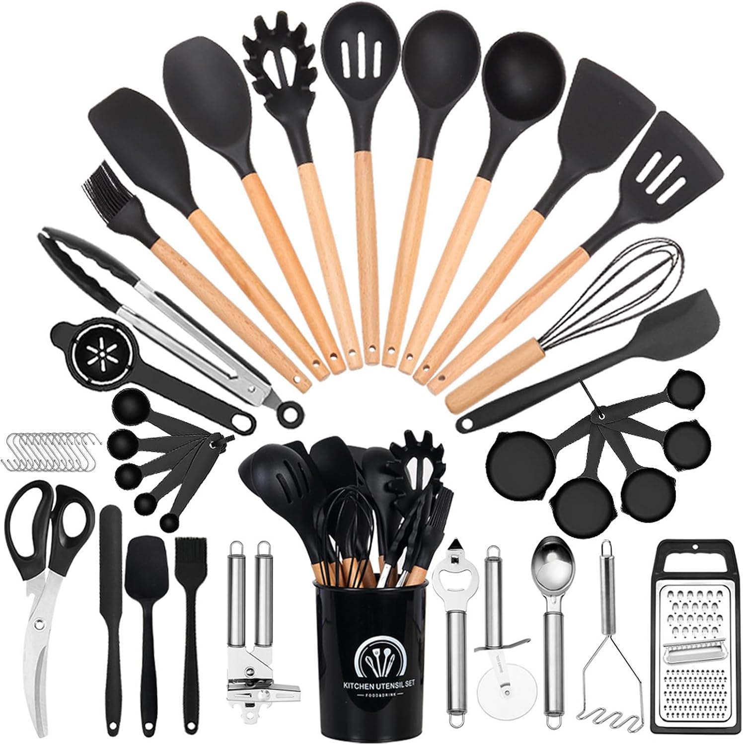 ARCHAEOPTERYX 46-Piece Non-Stick Silicone Cooking Utensils Set With Holder - Wooden Handle, Heat Resistant Kitchen Gadgets (Black)
