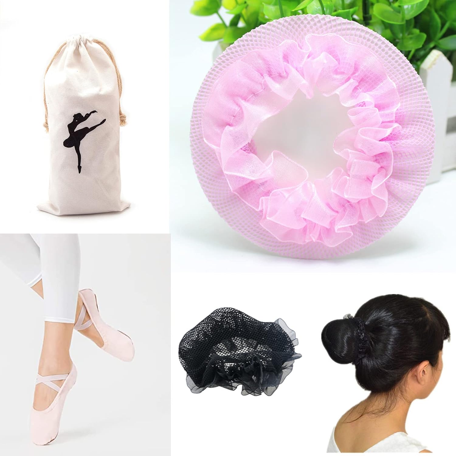 Dance shoe set: dance shoes; storage bag; hair net;