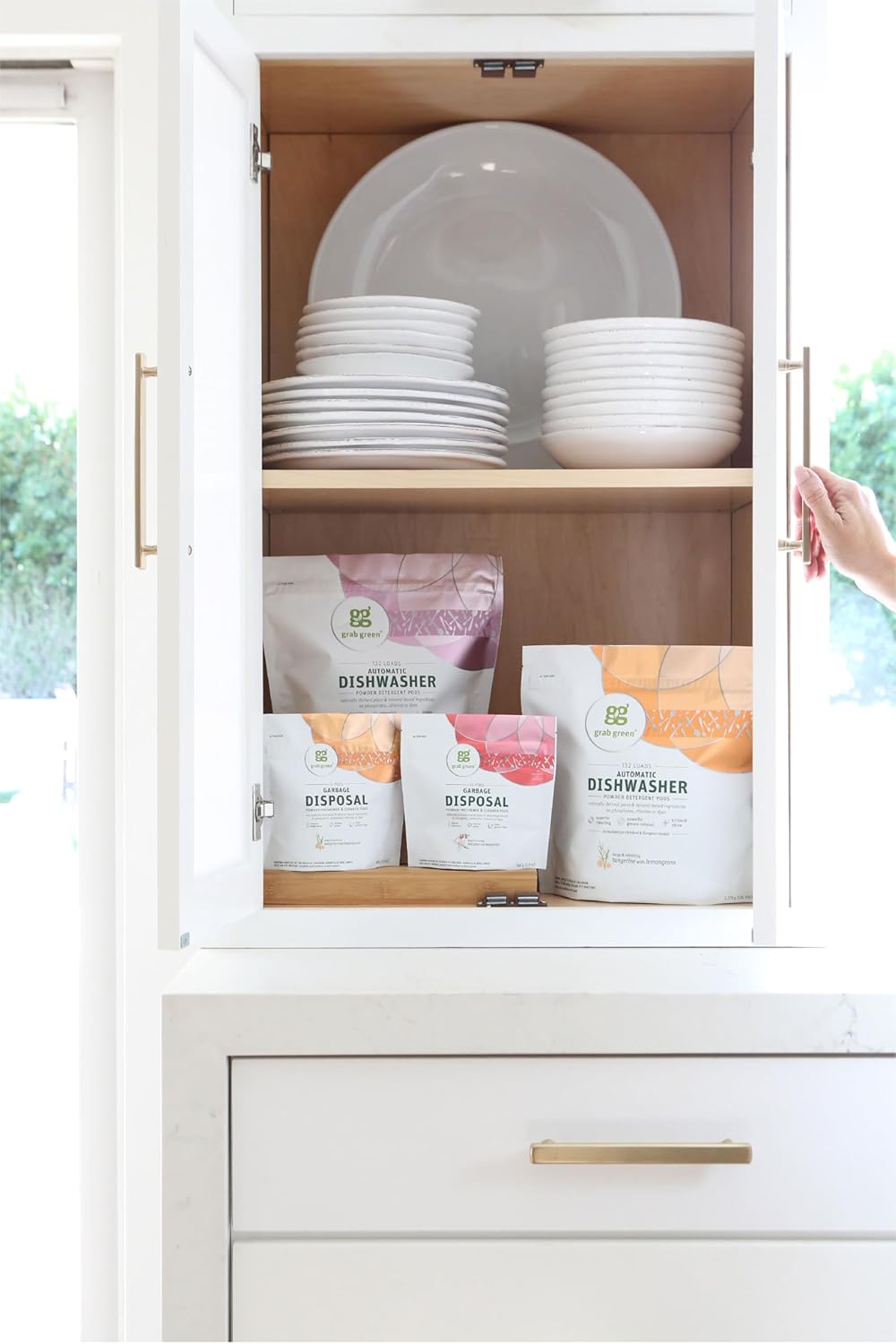 Grab Green Automatic Dishwashing Detergent Pods provide a superior clean, powerful grease removal, and a briiliant shine. Made with natural ingredients, our non-toxic formula provides an effective clean without harsh chemicals. These powerful pods easily cut through grease, grime and stuck on food and the clean rinse-formula means film-free, spot-free dishes every time. Our refreshing and bright tangerine with lemongrass fragrance is made with tangerine, lemongrass, elemi, bergamot, ginger, clary sage, mate, orange and lime essential oils. Our thoughtful packaging includes a convenient, easy to use velcro closure and clear use instructions. We believe in full ingredient disclosure that we call True Transparency which is why we list every ingredient and the purpose for each ingredient on every package. To protect your family, we developed our powder pods to contain multiple layers of safety: simple, white powder pods don’t look like colorful candy and are difficult to swallow. Grab Green is a female and mother owned and operated company that provides naturally derived and non-toxic laundry, home cleaning, and personal care products 100% made in the USA. Our products are eco-responsible and ensure safe and effective cleaning power for a healthy, happy home.