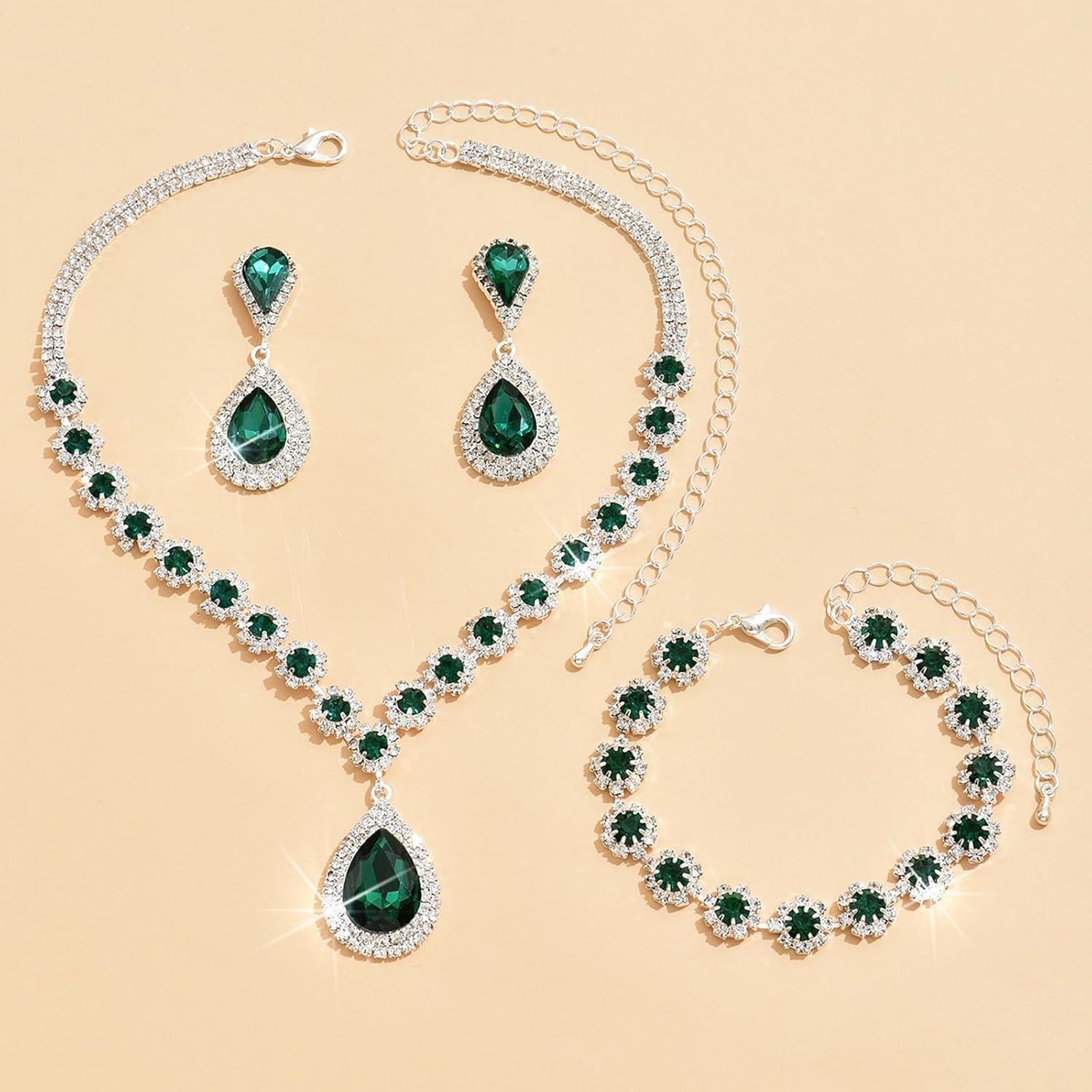 Green Bridal Jewelry Set Necklace Earrings Bracelet Silver Rhinestone Set Bridesmaid Prom Accessories Vacation Outfits