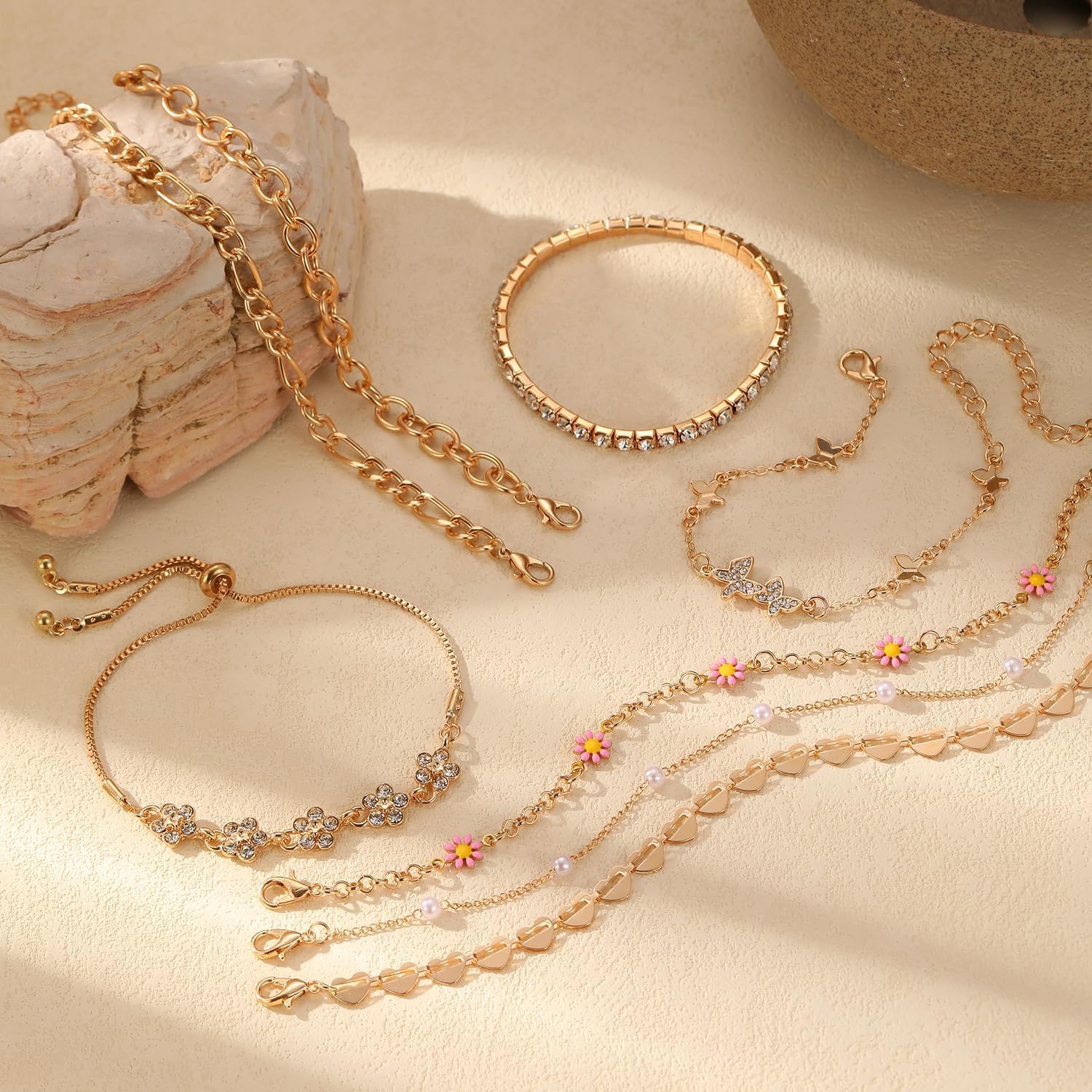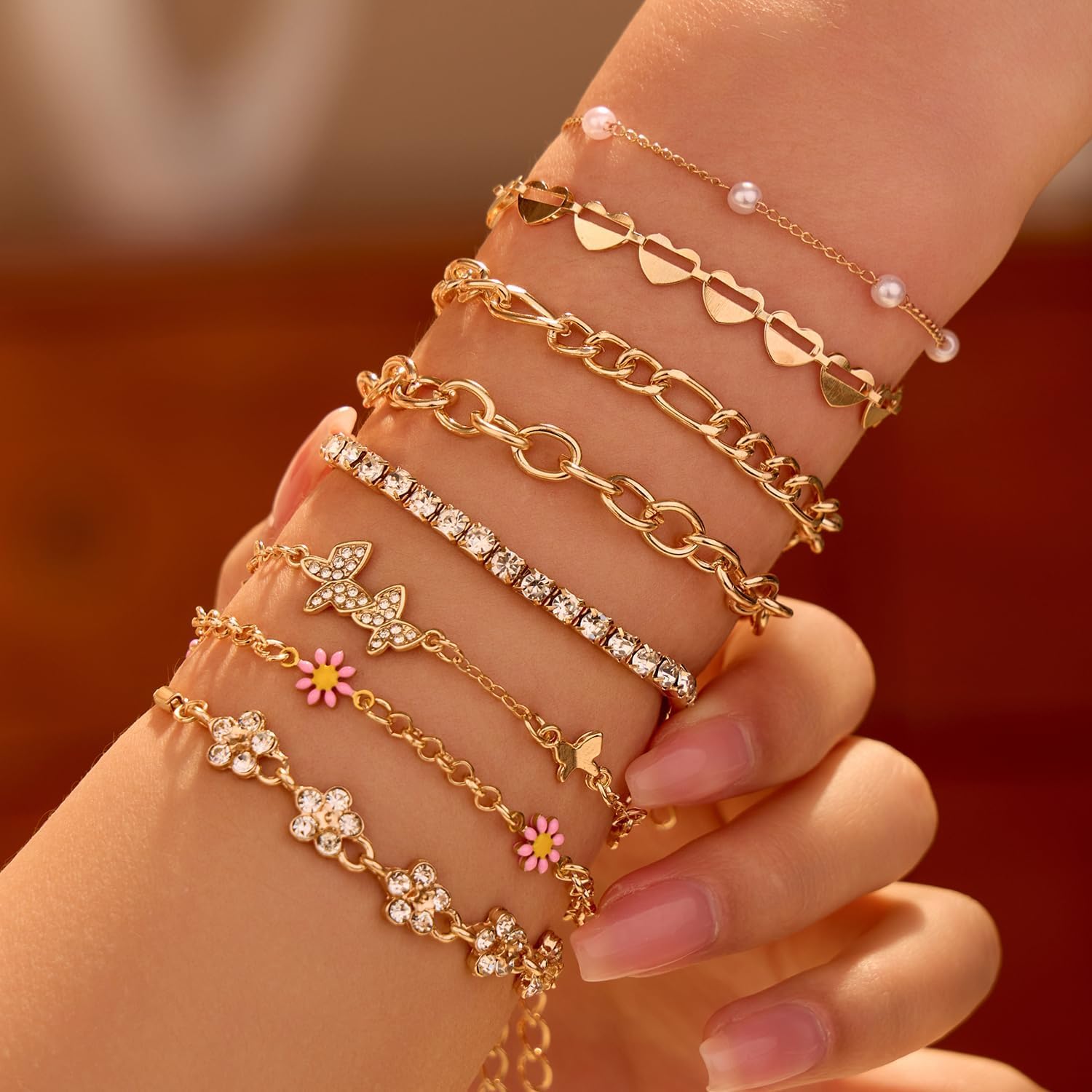 Heart Bracelets Set for Women, Chain Layered Bracelets Collection, Layered Cuba Beaded Chians for Your Wrist, Stackable Bracelet Stack Set, Adjustable Charm Link Bow Butterfly Heart Jewelry Sets