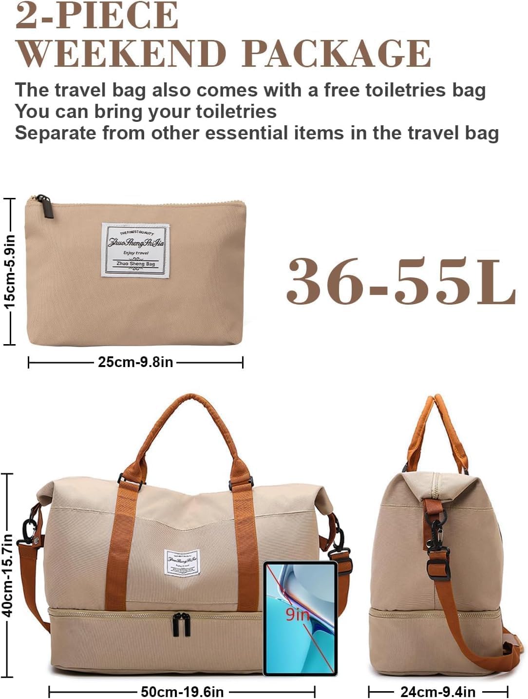 Homarket Travel Duffel Bag, Weekend Bag with Trolley Sleeve, 40x20x25 Cabin Bag for Ryanair Airlines, Dry & Wet Seperated Sports Gym Carry On Bag for Women Men 2 Piece Set (Khaki)
